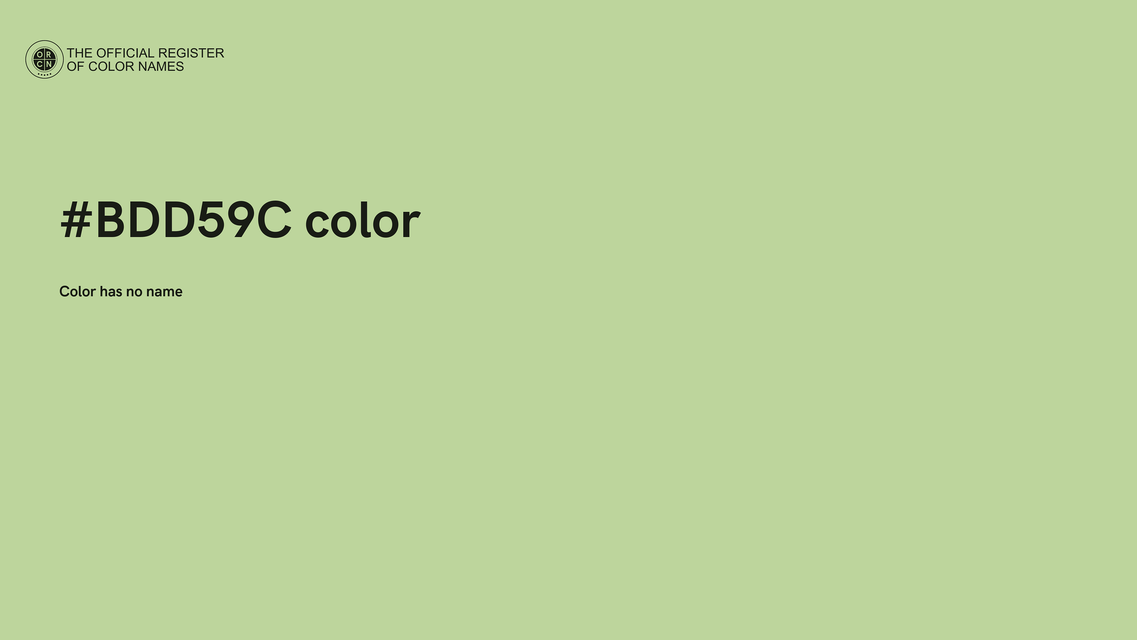 For printing in non digital world, #BDD59C is represented in CMYK as 9 Cyan, 0 Magenta, 22 Yellow, and 16 Black (Key) (C:9 M:0 Y:22 K:16).