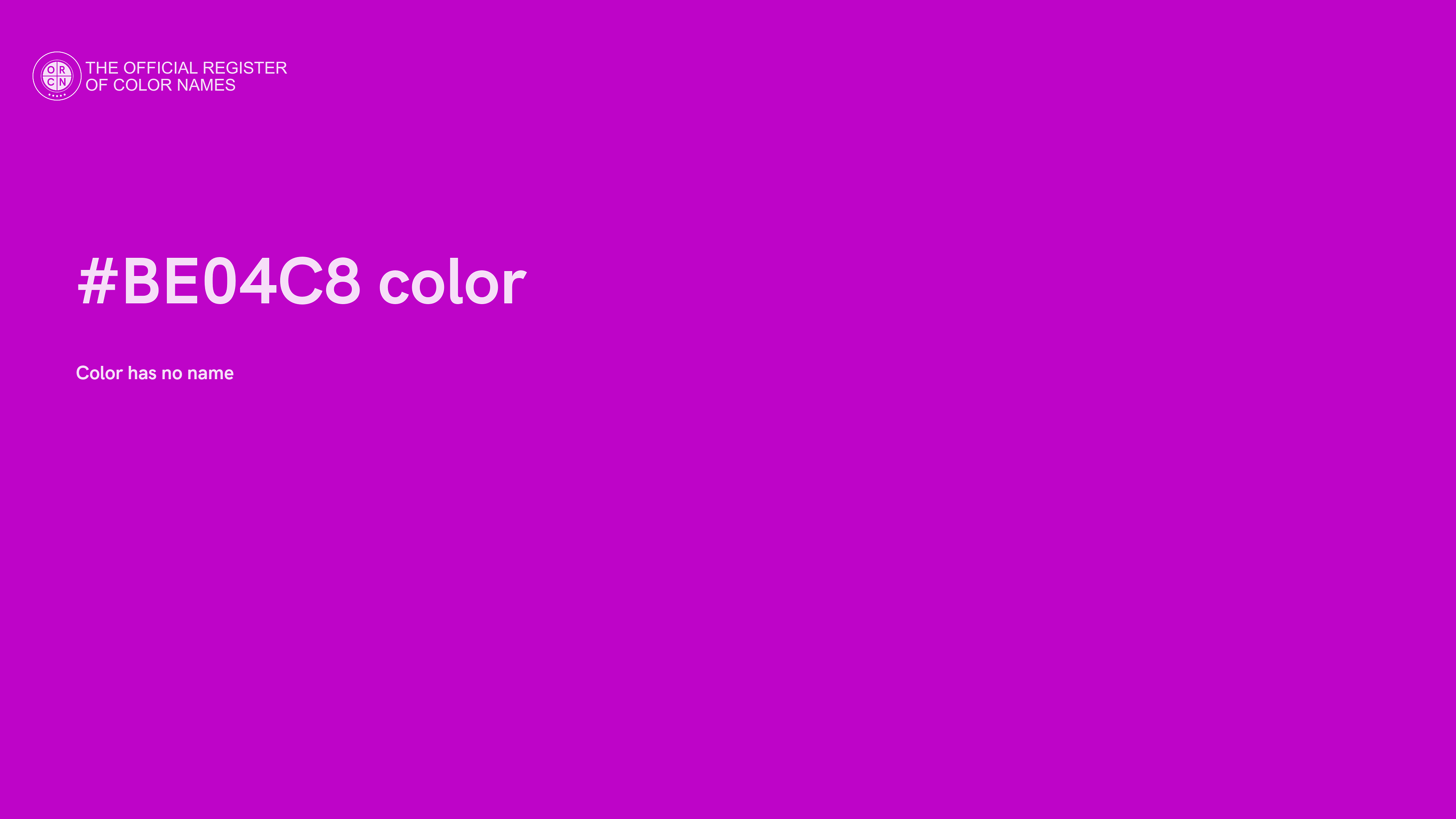 For printing in non digital world, #BE04C8 is represented in CMYK as 4 Cyan, 77 Magenta, 0 Yellow, and 22 Black (Key) (C:4 M:77 Y:0 K:22).