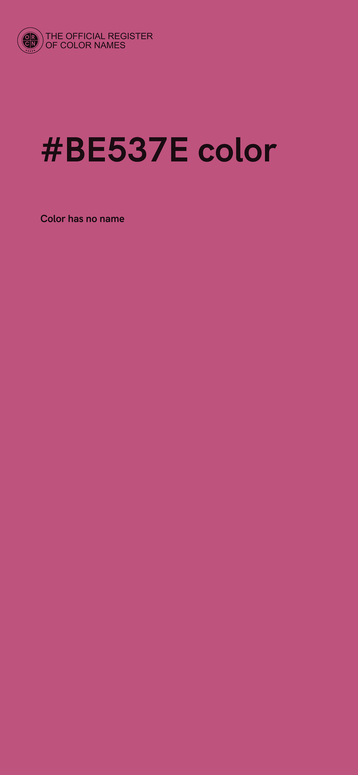 The digital color HEX #BE537E belongs to the Rose Color Family featuring Moderate Saturation (Saturation Family) and Light (Brightness Family).