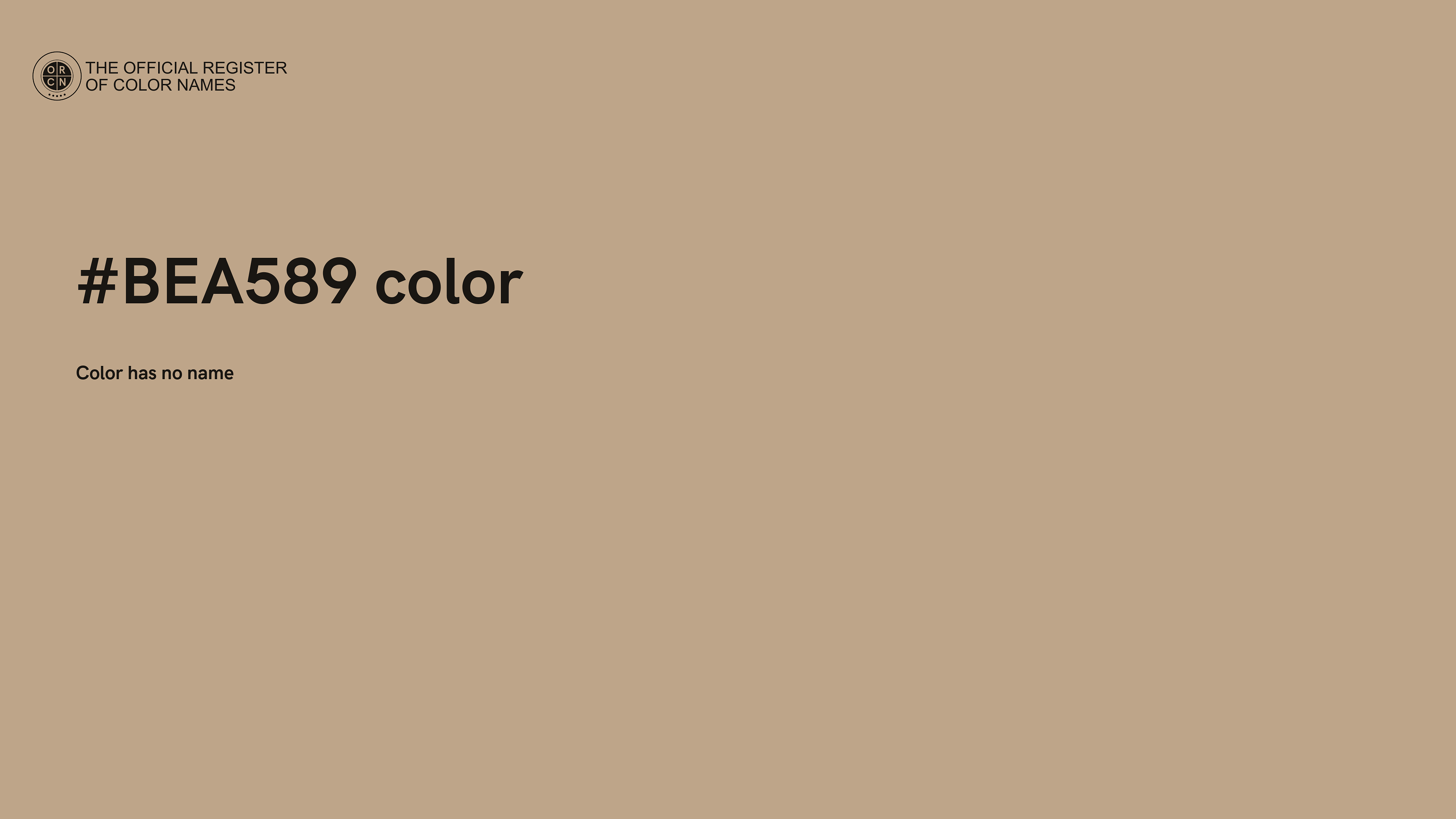 The digital color HEX #BEA589 belongs to the Orange Color Family featuring Mild Saturation (Saturation Family) and Very Light (Brightness Family).