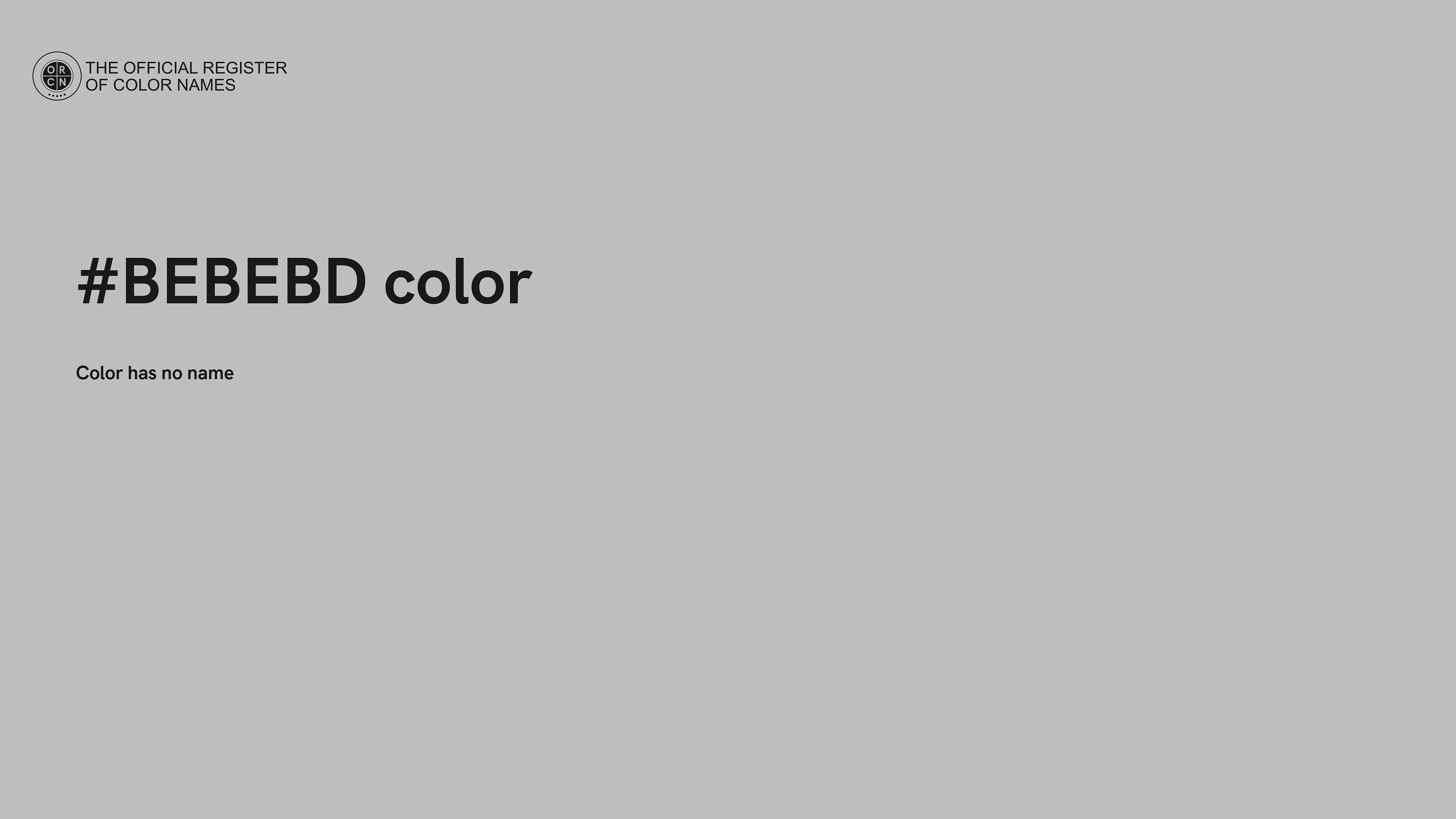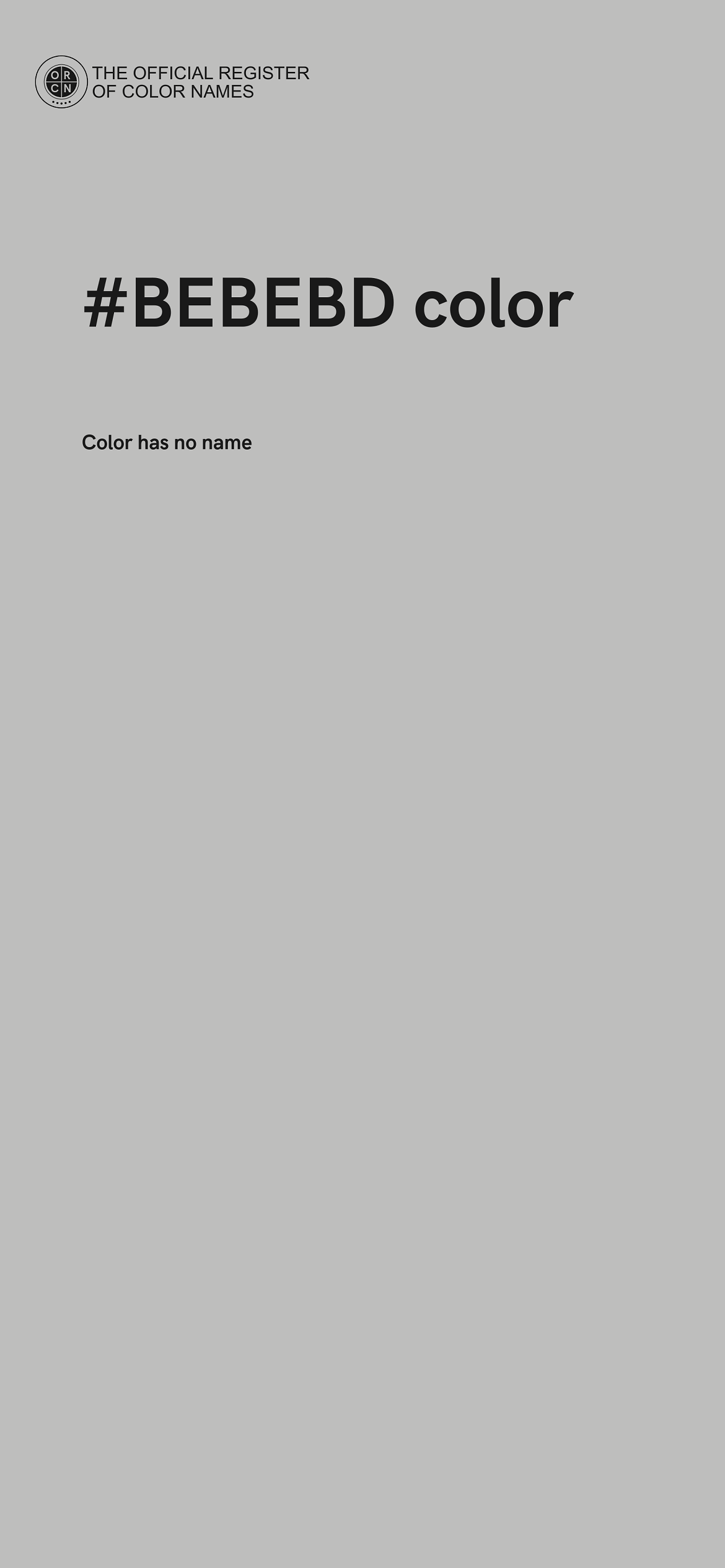 The digital color HEX #BEBEBD belongs to the Yellow Color Family featuring Desaturated (Saturation Family) and Very Light (Brightness Family).