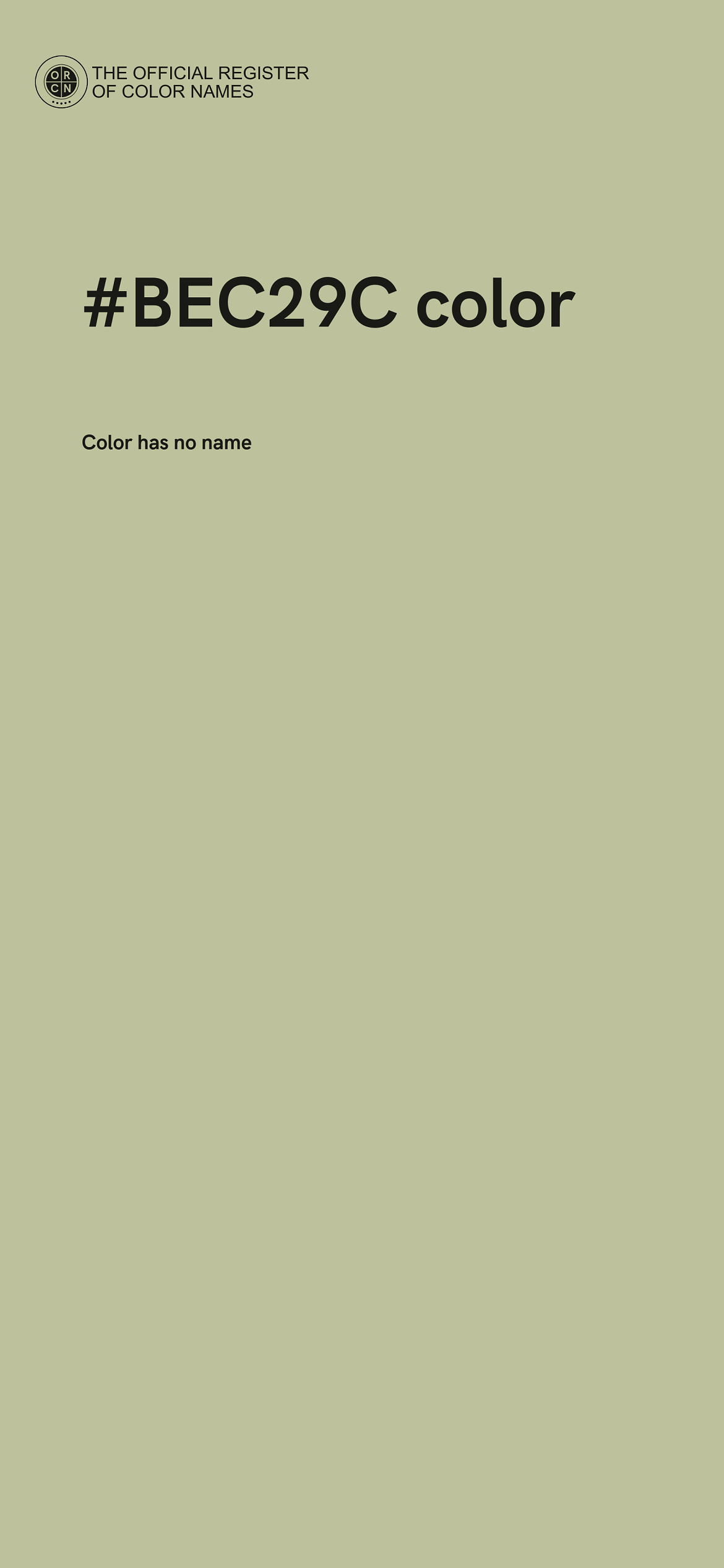 HEX code #BEC29C represent the color in hexadecimal format by combining three values – the amounts of Red, Green and Blue (RGB). Its RGB composition is 190, 194, 156 ( rgb(190, 194, 156) ), which breaks down into 74.5% of Red, 76.1% Green and 61.2% Blue.