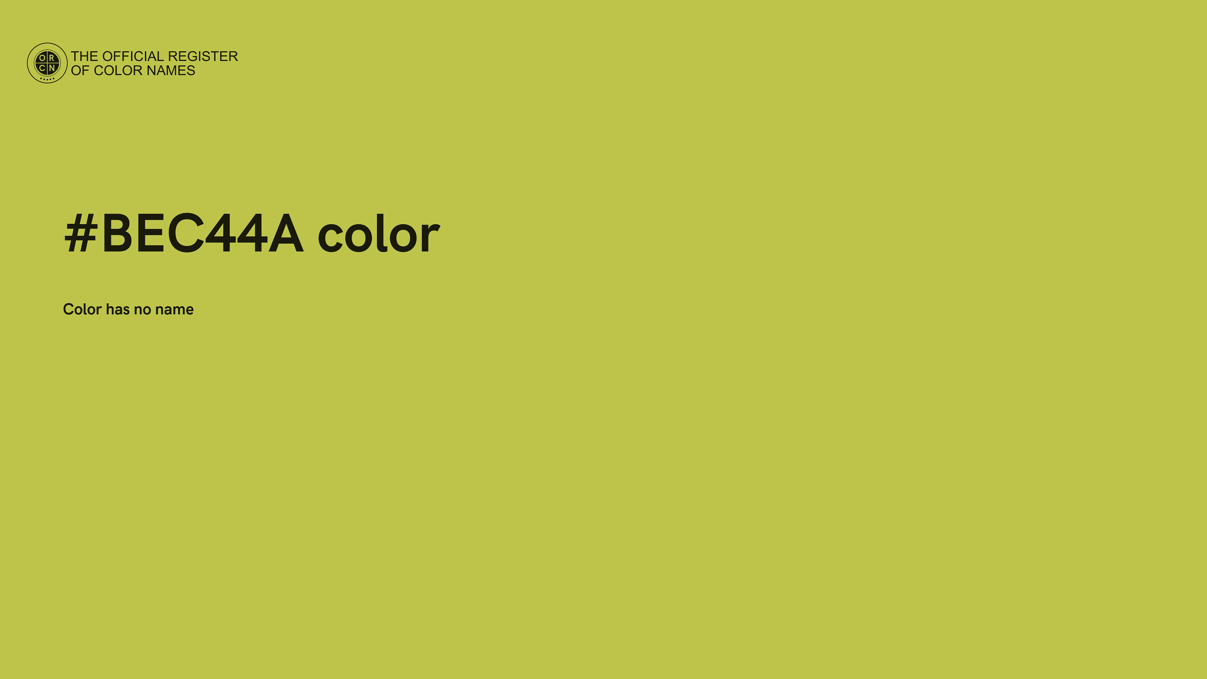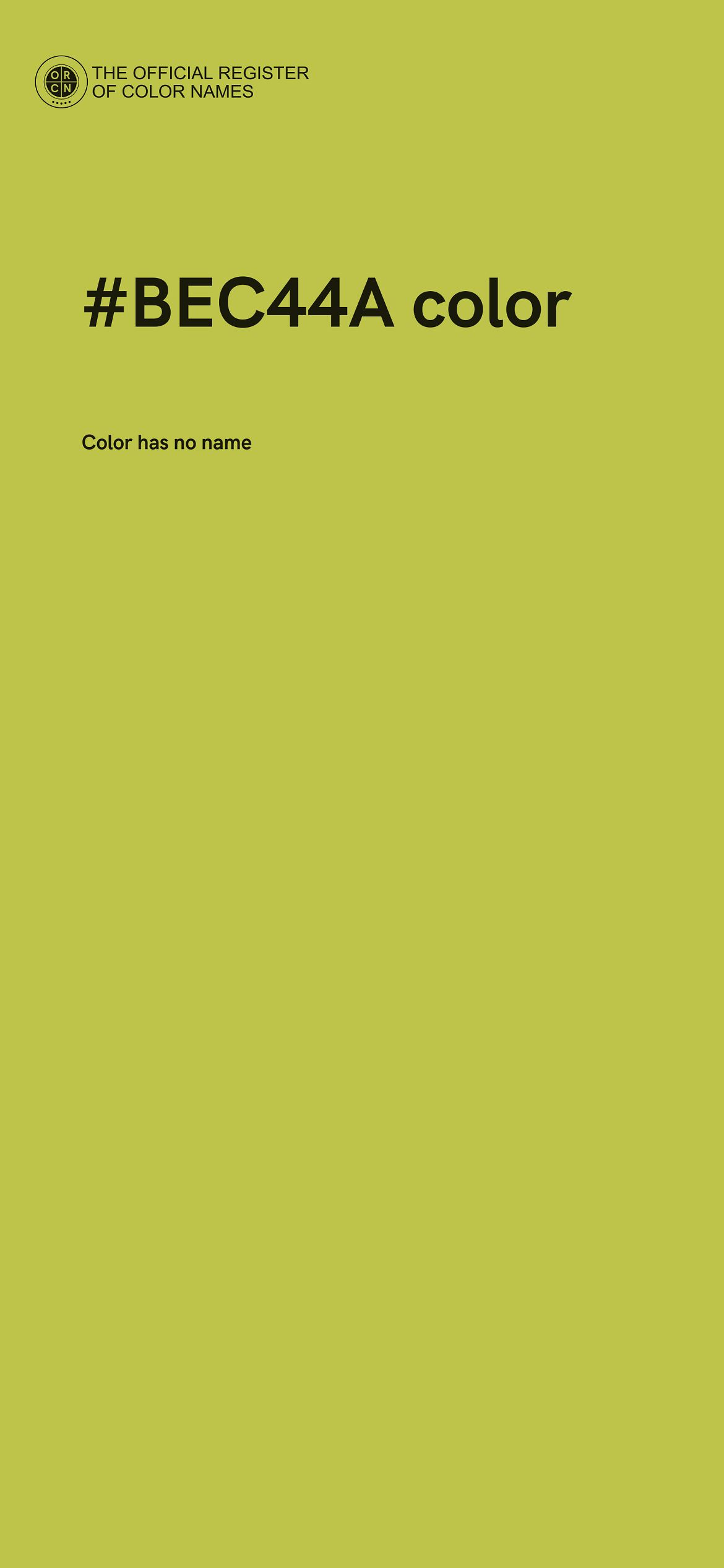 For printing in non digital world, #BEC44A is represented in CMYK as 2 Cyan, 0 Magenta, 48 Yellow, and 23 Black (Key) (C:2 M:0 Y:48 K:23).