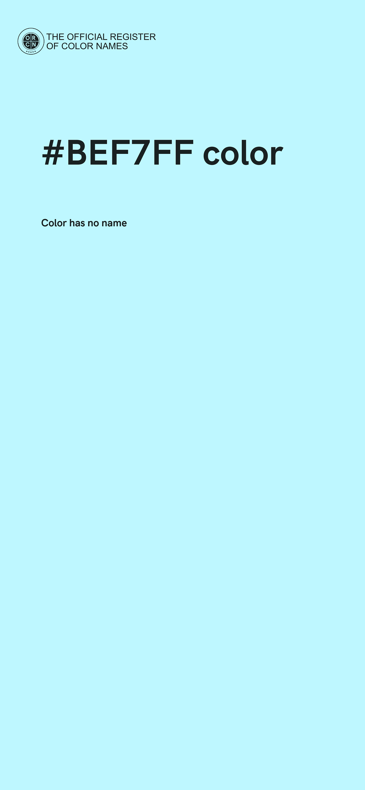 The digital color HEX #BEF7FF belongs to the Cyan Color Family featuring Full Saturation (Saturation Family) and Luminous (Brightness Family).