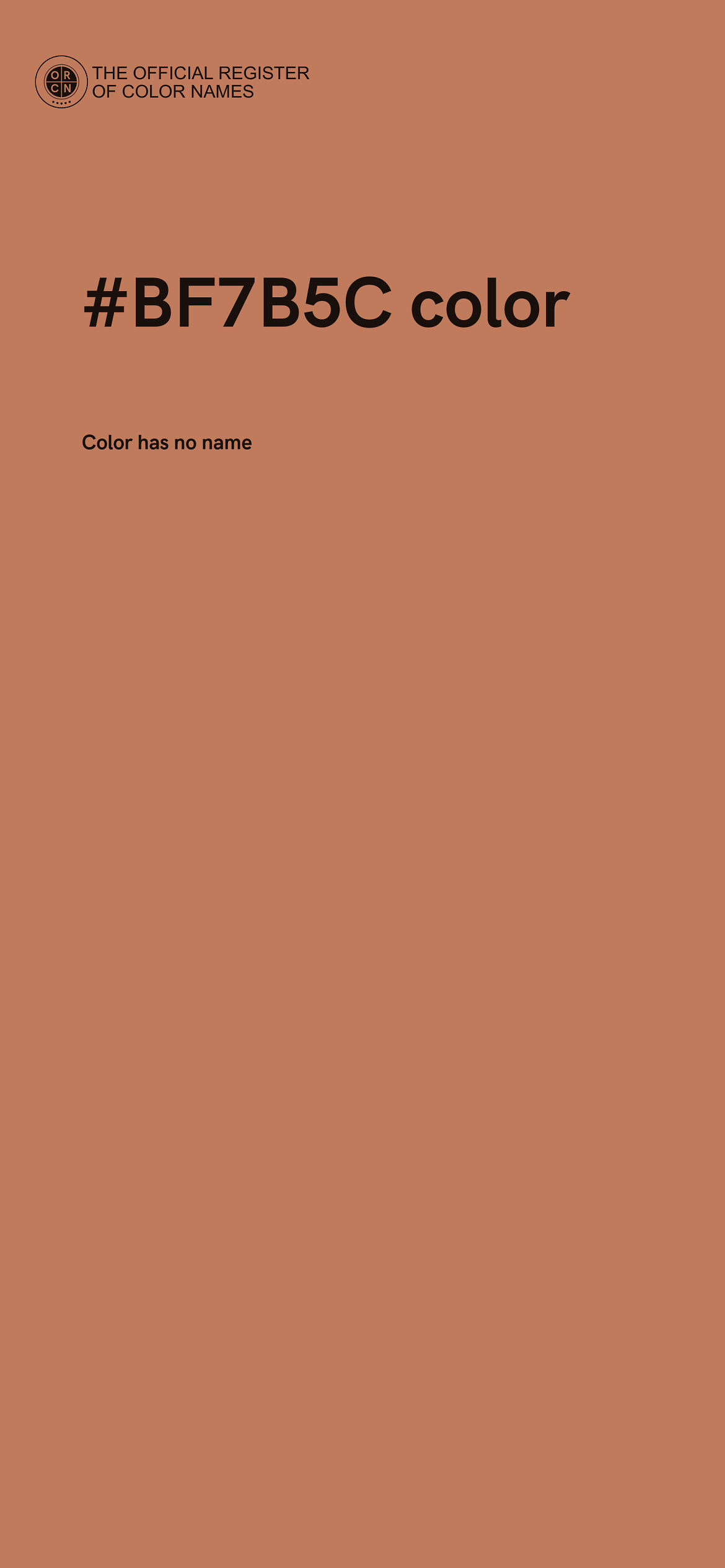 The digital color HEX #BF7B5C belongs to the Orange Color Family featuring Moderate Saturation (Saturation Family) and Light (Brightness Family).
