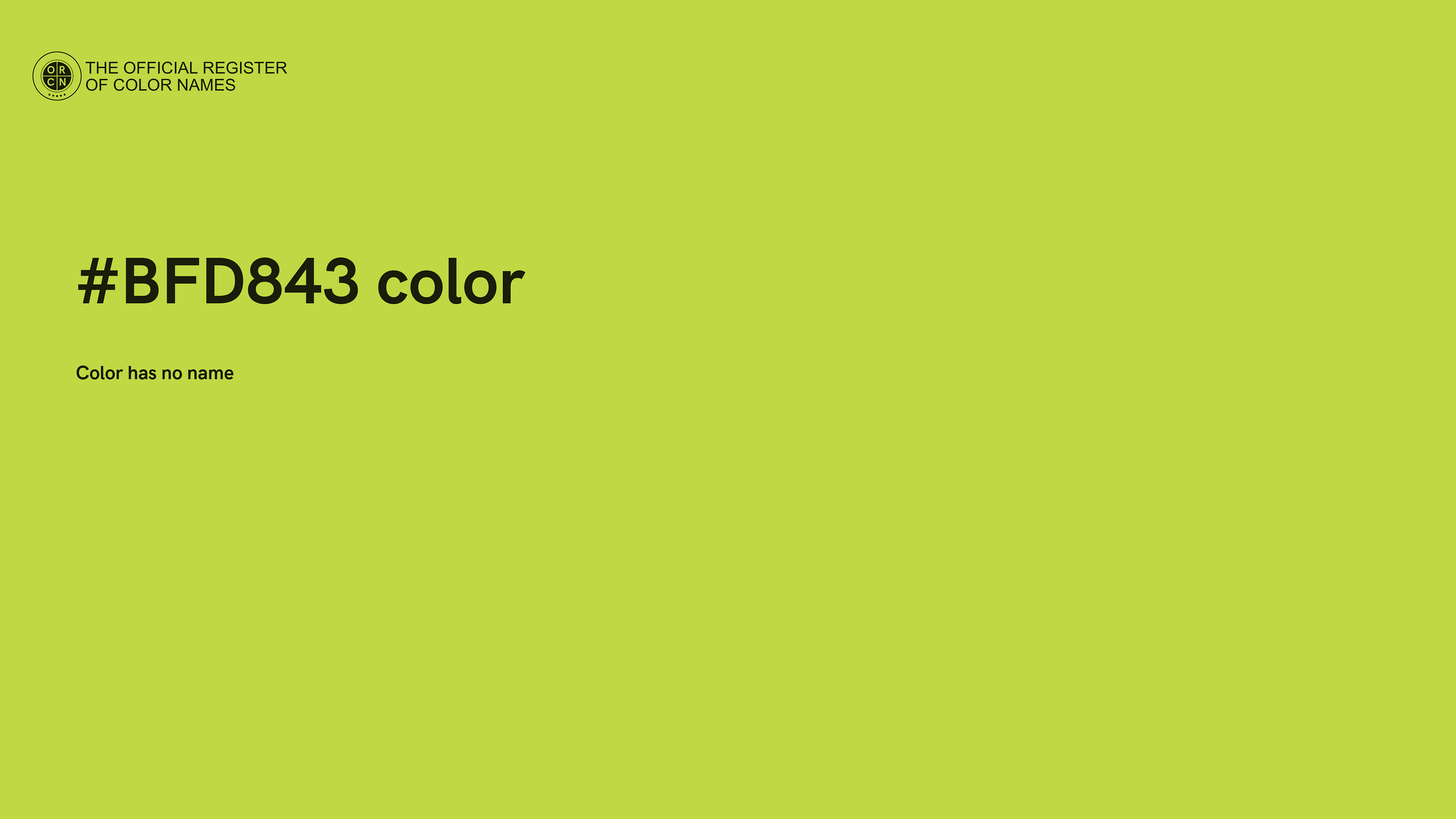 For printing in non digital world, #BFD843 is represented in CMYK as 10 Cyan, 0 Magenta, 58 Yellow, and 15 Black (Key) (C:10 M:0 Y:58 K:15).