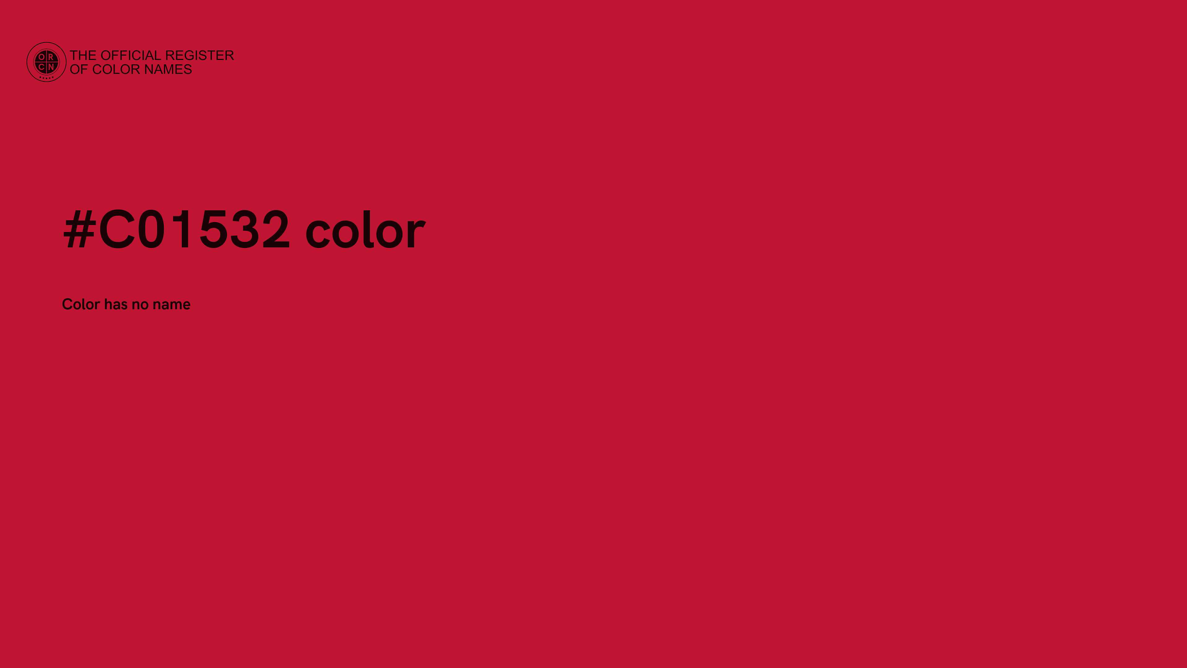 The digital color HEX #C01532 belongs to the Red Color Family featuring High Saturation (Saturation Family) and Light (Brightness Family).