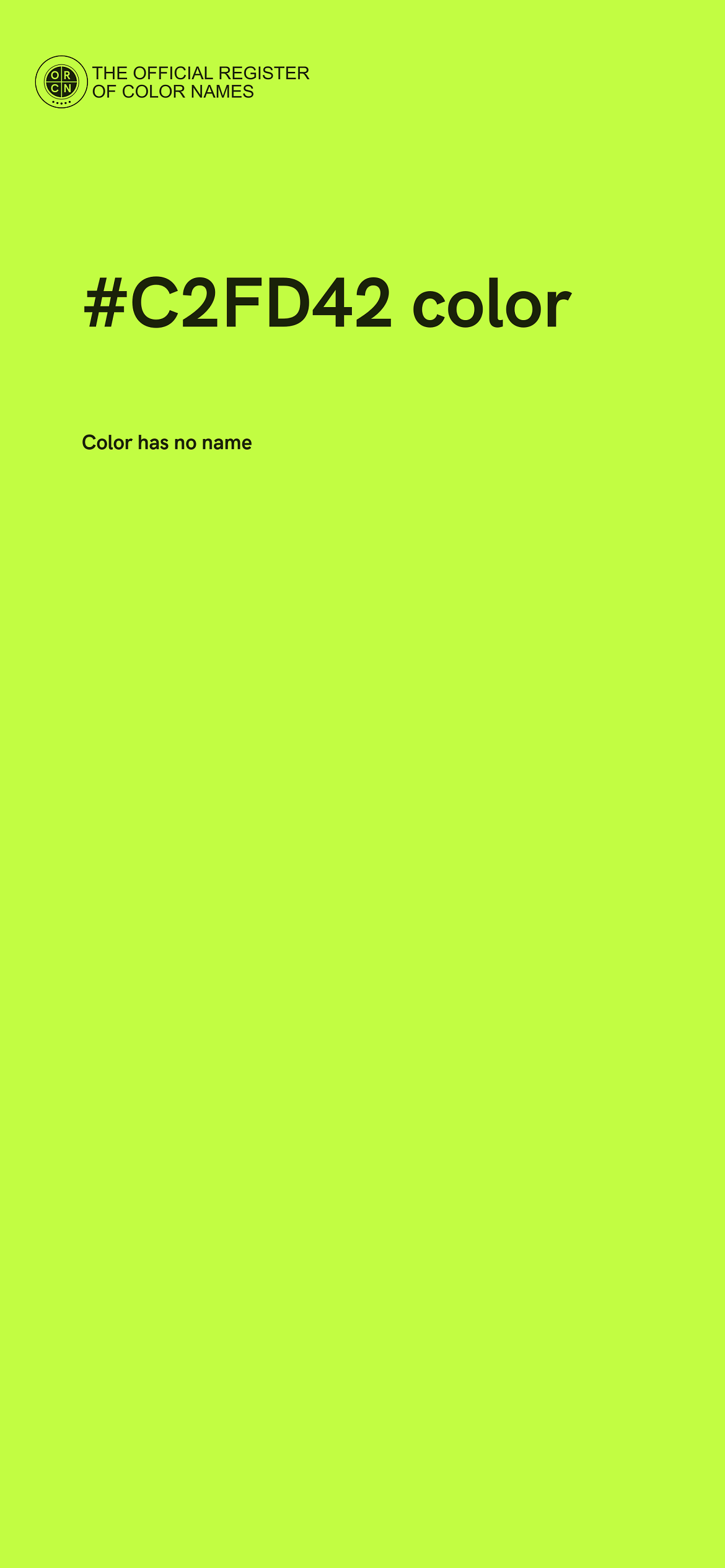 The digital color HEX #C2FD42 belongs to the Chartreuse Color Family featuring Full Saturation (Saturation Family) and Very Light (Brightness Family).