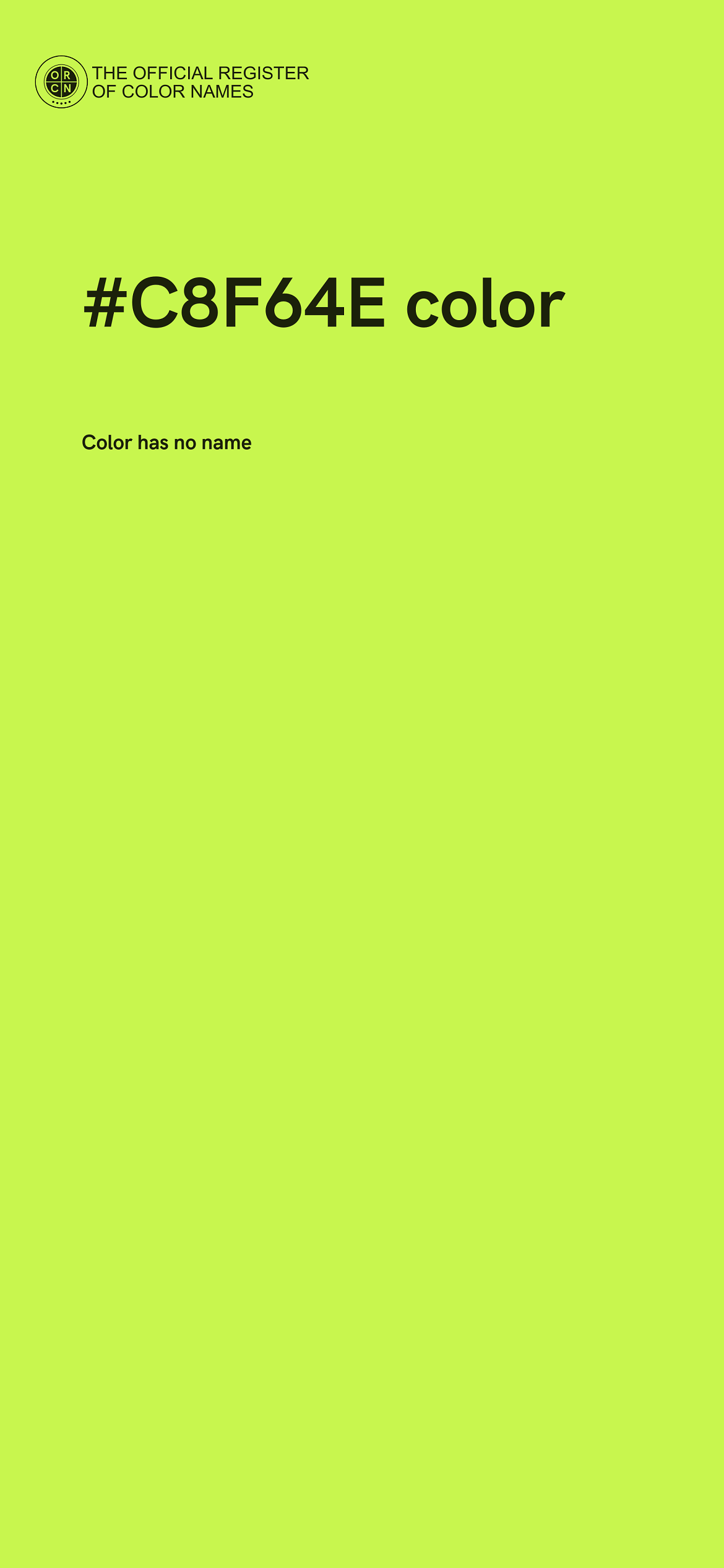 The digital color HEX #C8F64E belongs to the Chartreuse Color Family featuring Full Saturation (Saturation Family) and Very Light (Brightness Family).