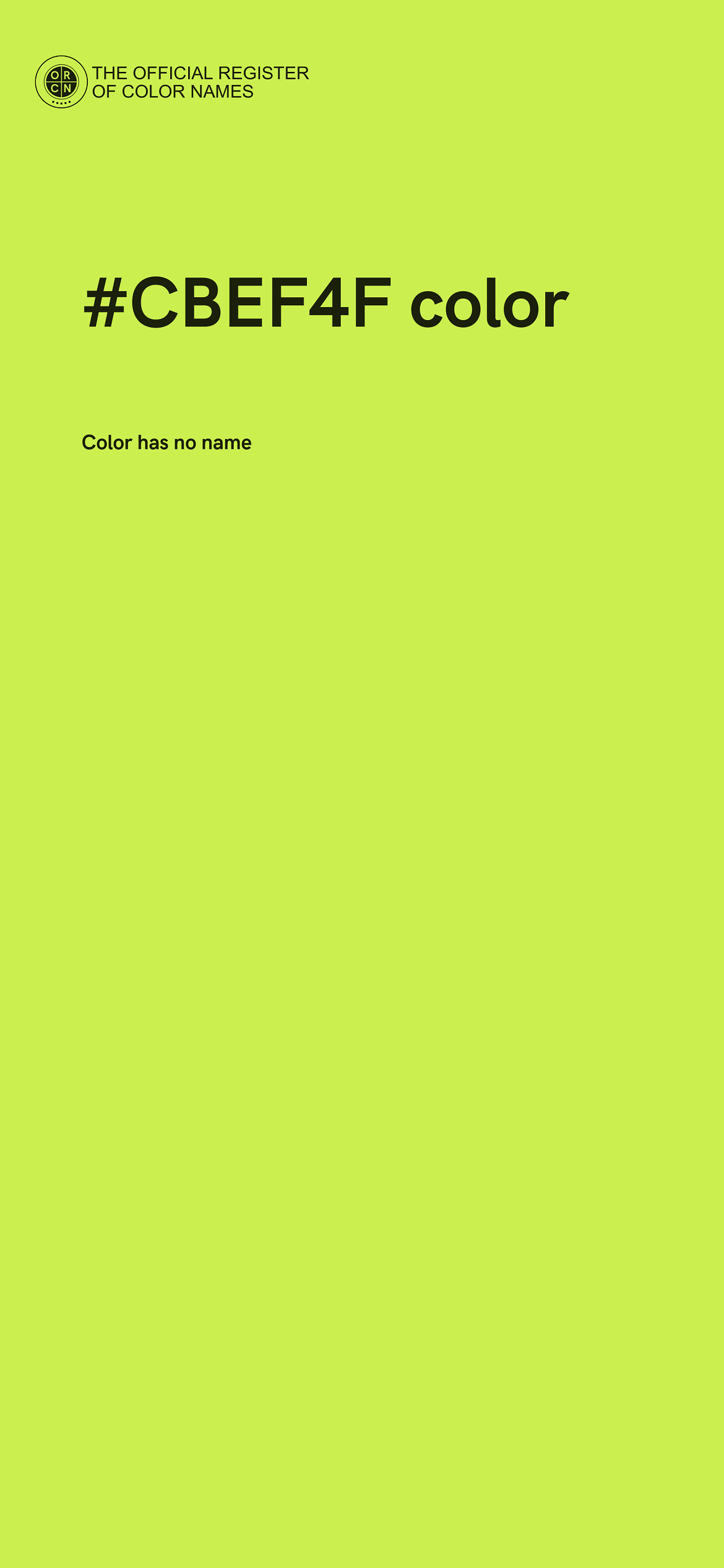 The digital color HEX #CBEF4F belongs to the Yellow Color Family featuring High Saturation (Saturation Family) and Very Light (Brightness Family).