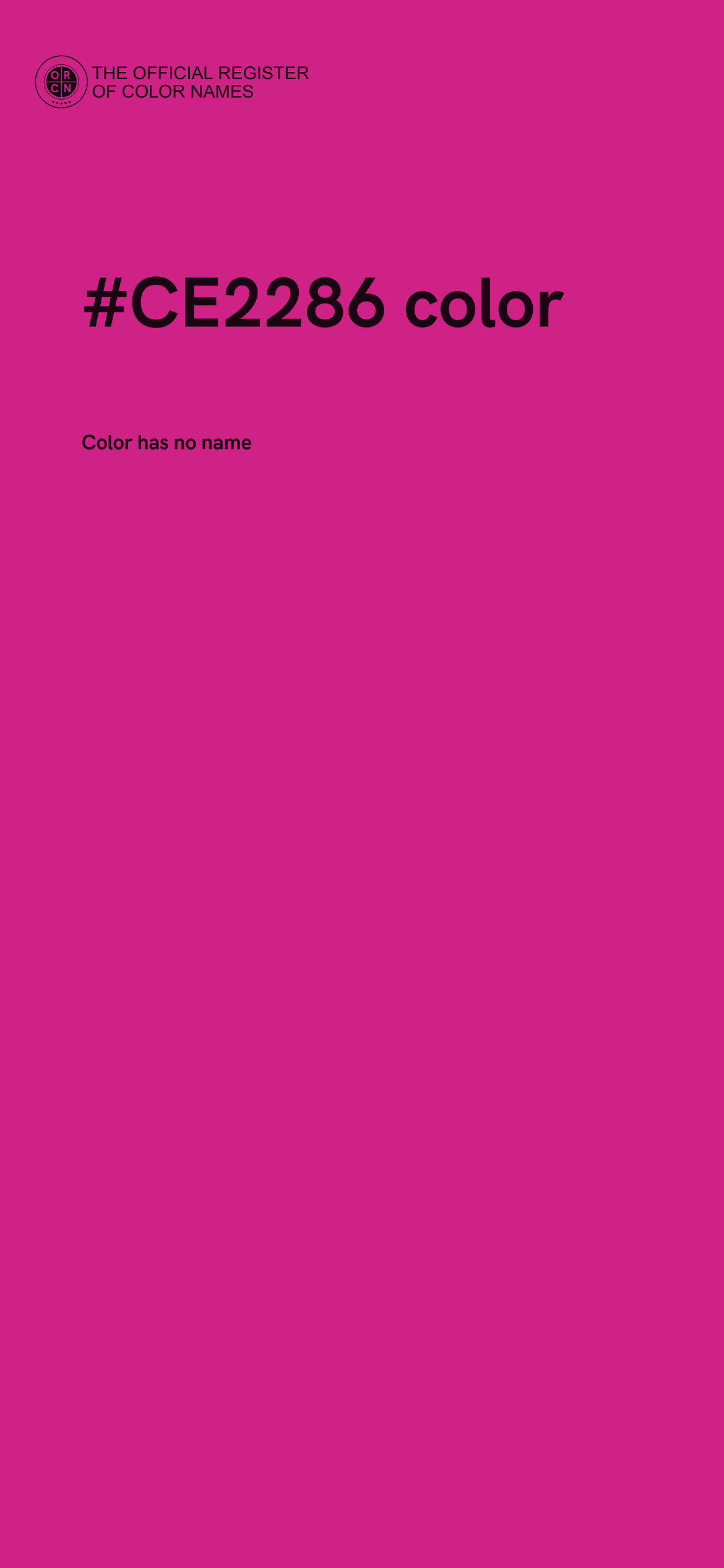 The digital color HEX #CE2286 belongs to the Rose Color Family featuring High Saturation (Saturation Family) and Light (Brightness Family).