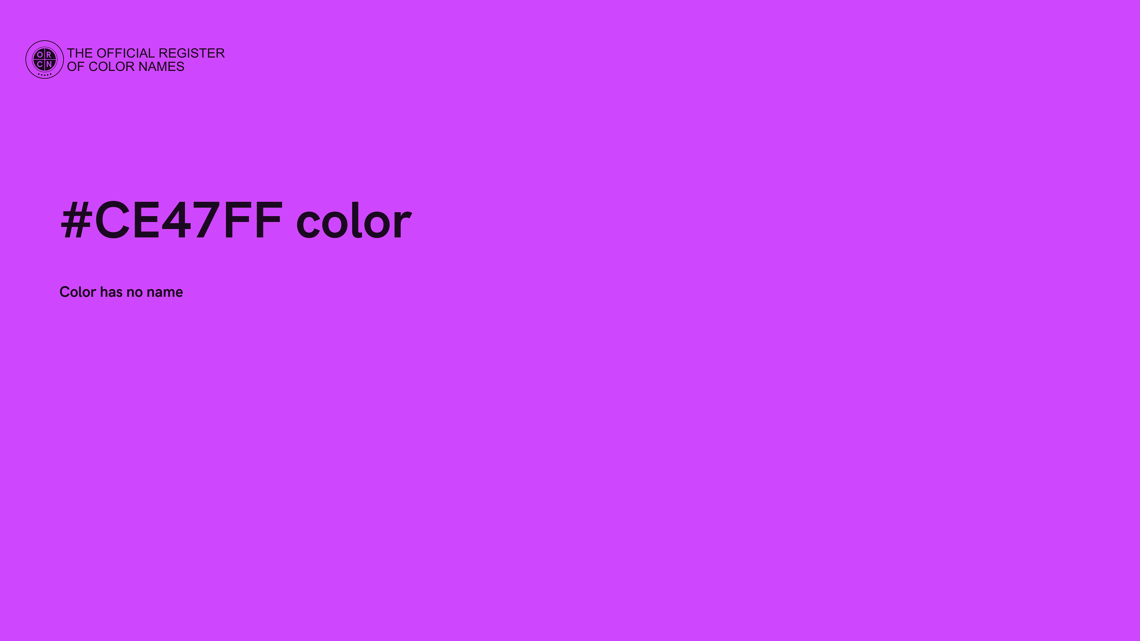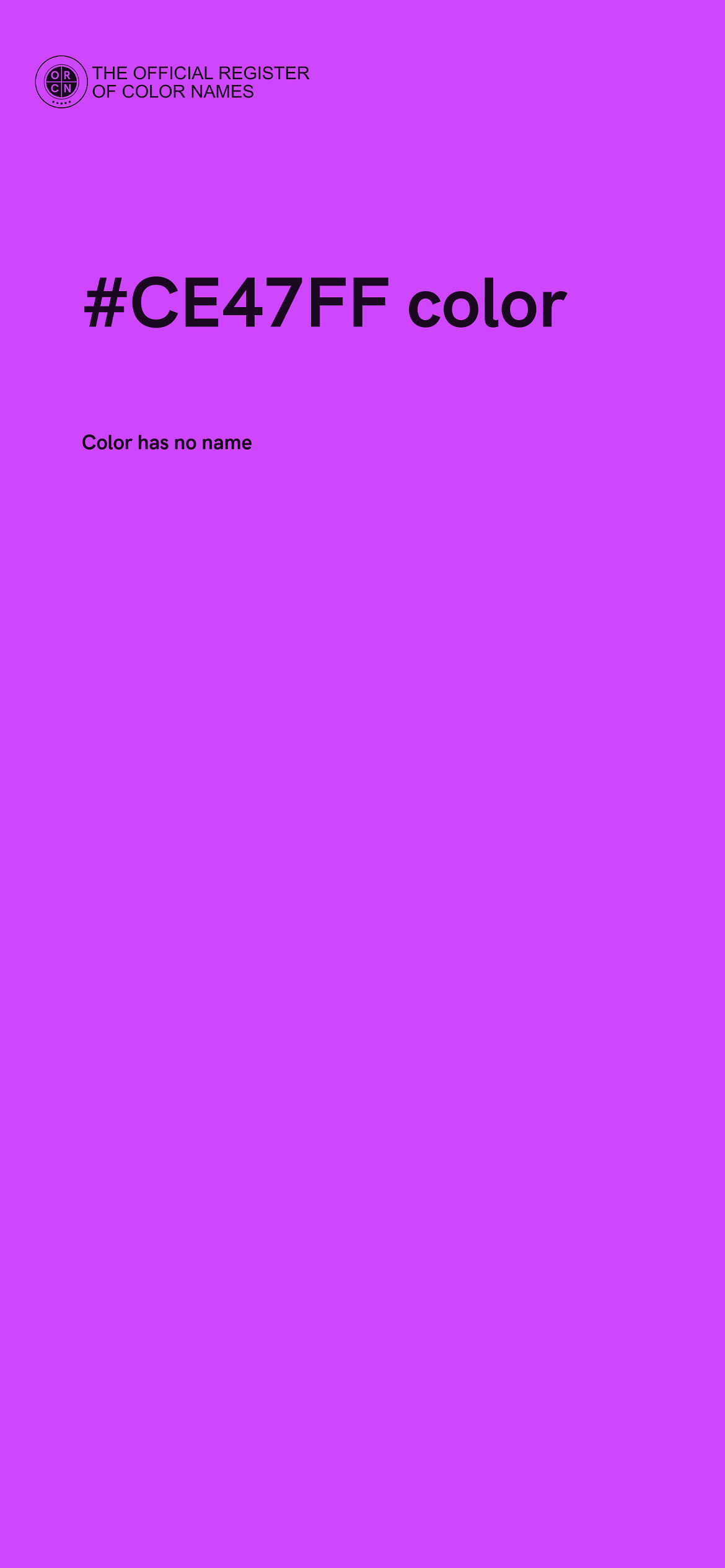 The digital color HEX #CE47FF belongs to the Violet Color Family featuring Full Saturation (Saturation Family) and Very Light (Brightness Family).