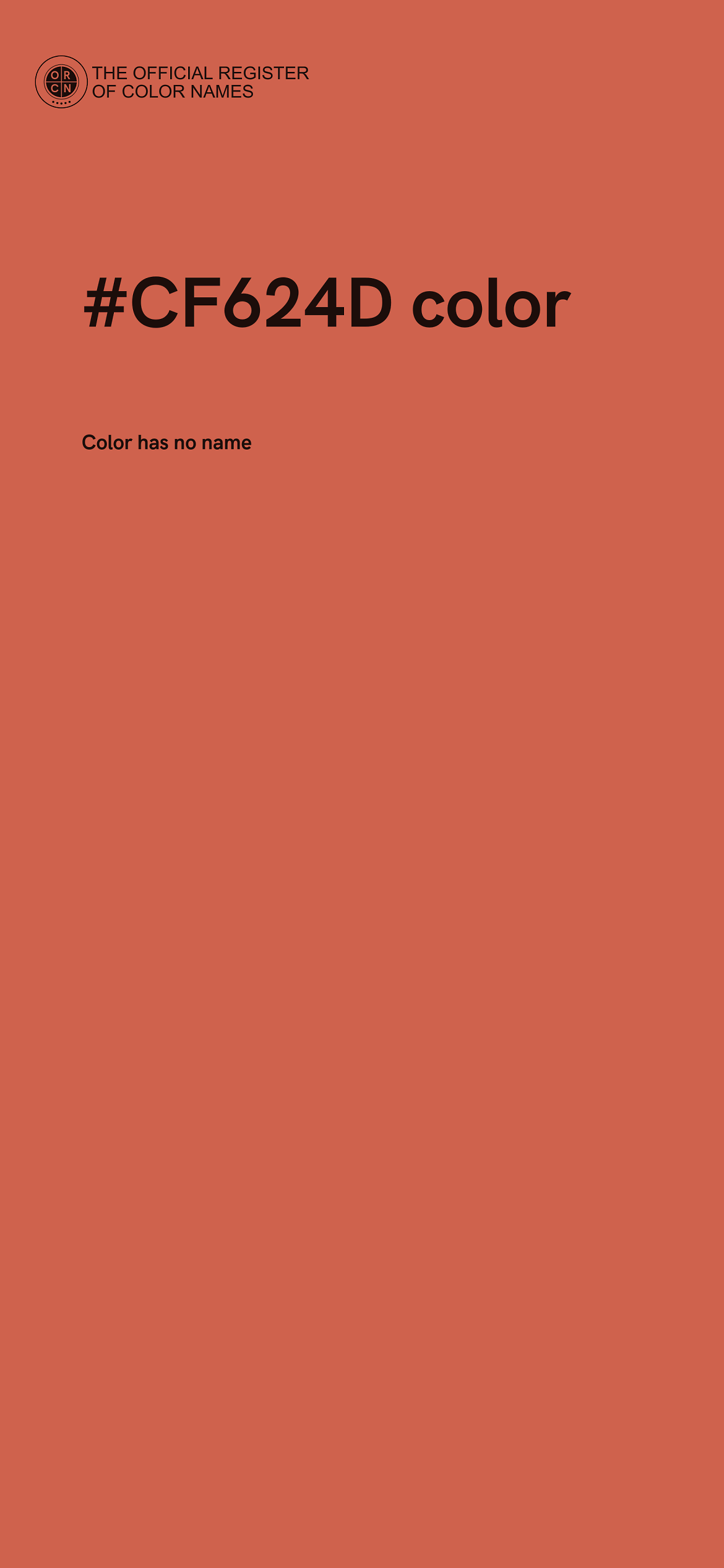 The digital color HEX #CF624D belongs to the Red Color Family featuring Moderate Saturation (Saturation Family) and Light (Brightness Family).