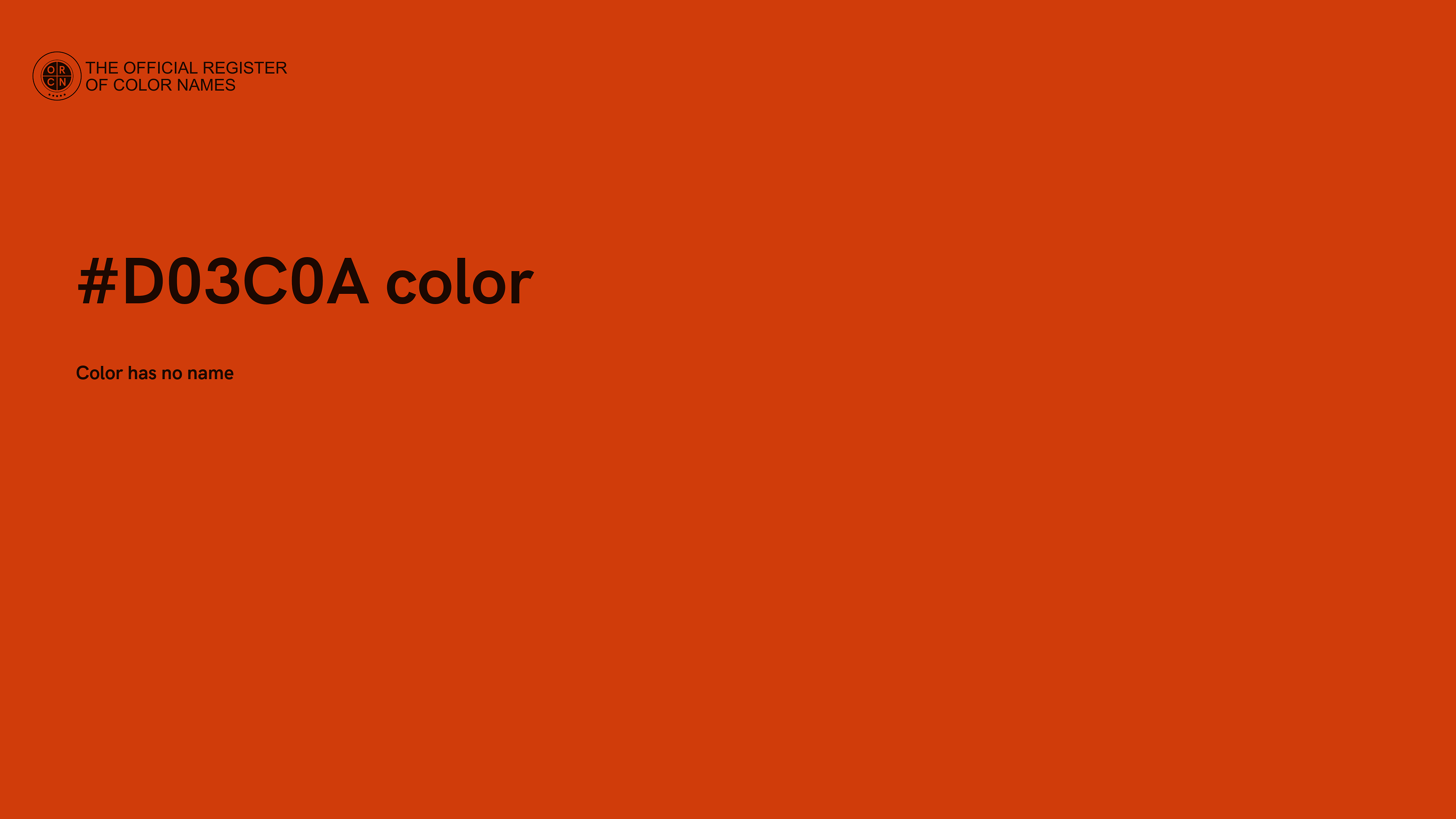 The digital color HEX #D03C0A belongs to the Orange Color Family featuring Full Saturation (Saturation Family) and Light (Brightness Family).
