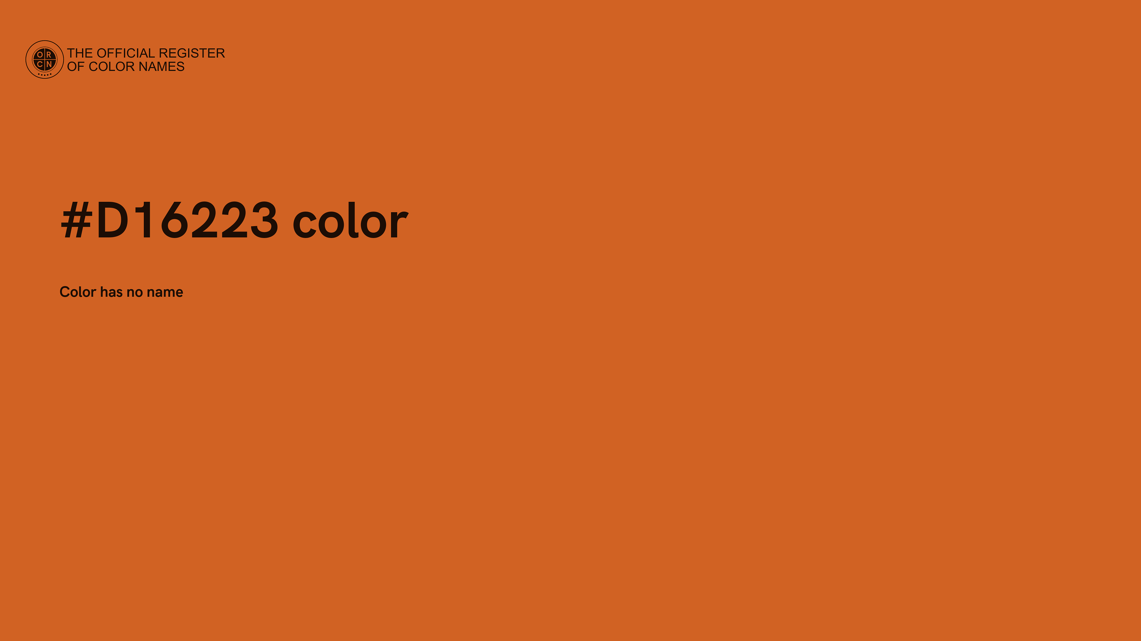 HEX code #D16223 represent the color in hexadecimal format by combining three values – the amounts of Red, Green and Blue (RGB). Its RGB composition is 209, 98, 35 ( rgb(209, 98, 35) ), which breaks down into 82% of Red, 38.4% Green and 13.7% Blue.