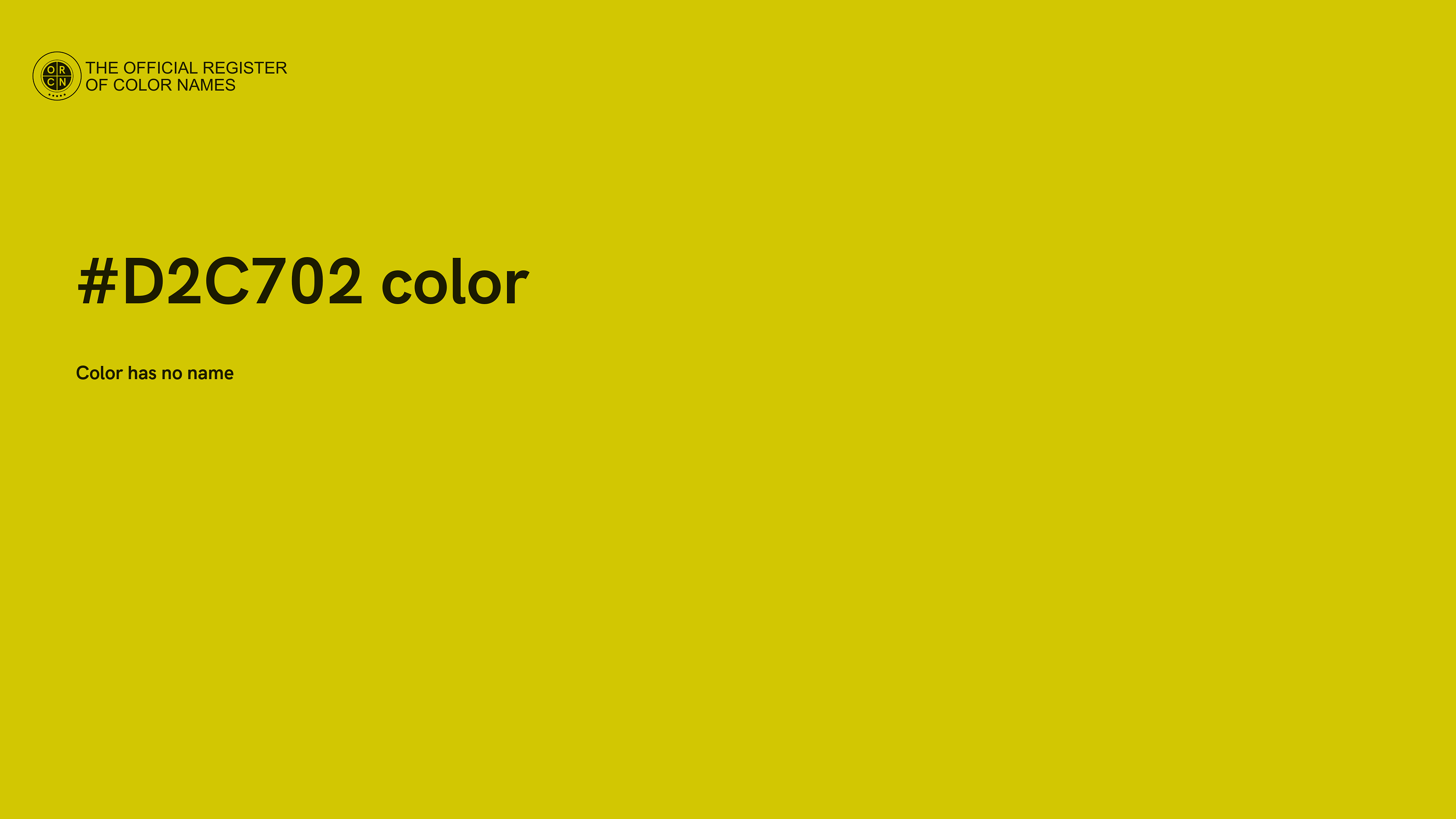 The digital color HEX #D2C702 belongs to the Yellow Color Family featuring Full Saturation (Saturation Family) and Light (Brightness Family).