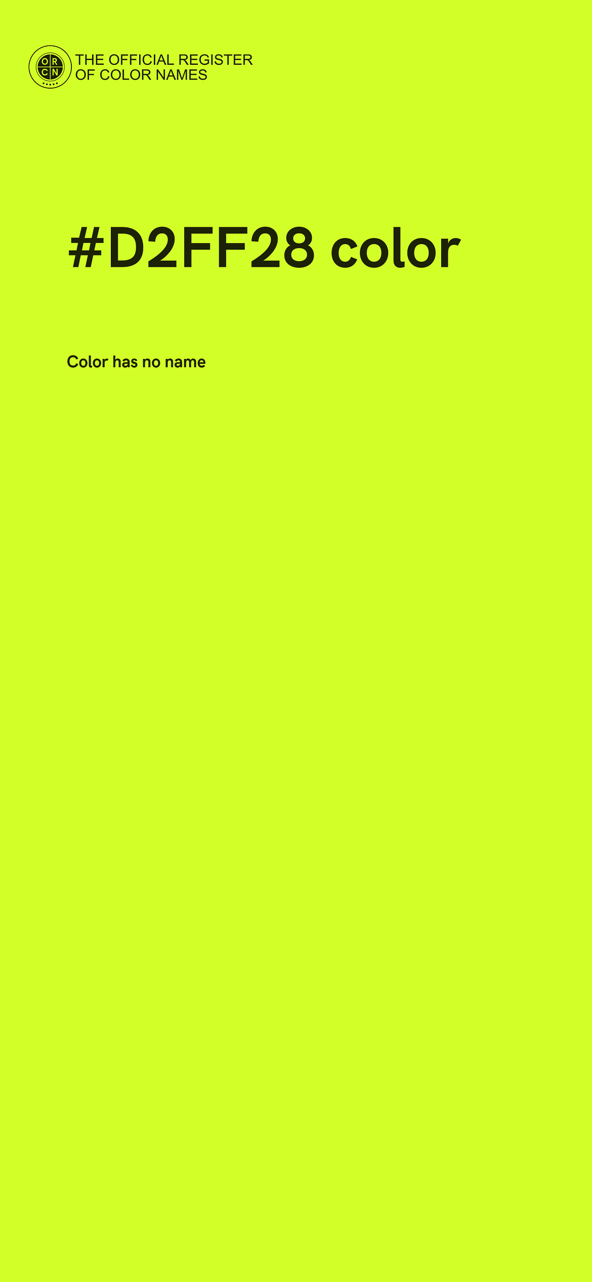 The digital color HEX #D2FF28 belongs to the Yellow Color Family featuring Full Saturation (Saturation Family) and Light (Brightness Family).