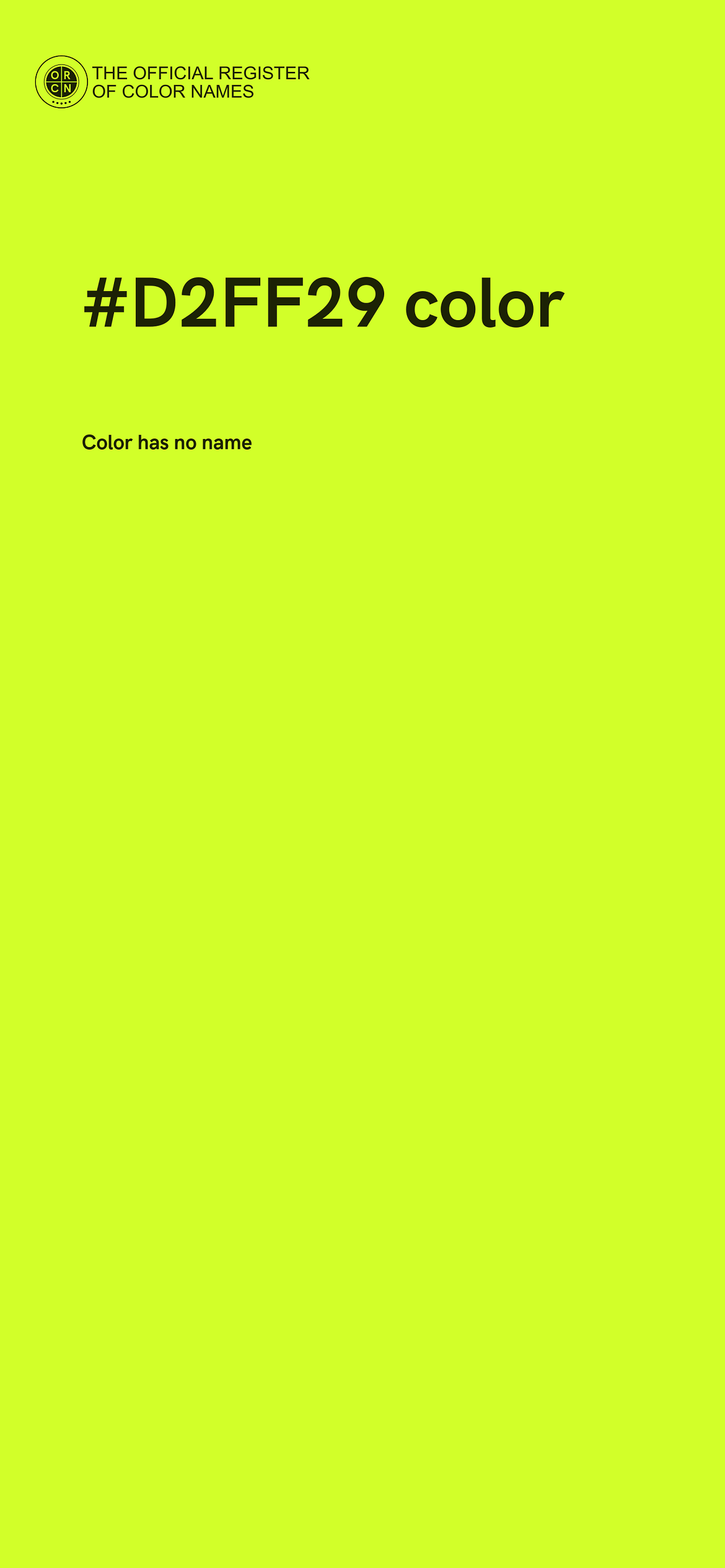 The digital color HEX #D2FF29 belongs to the Yellow Color Family featuring Full Saturation (Saturation Family) and Light (Brightness Family).