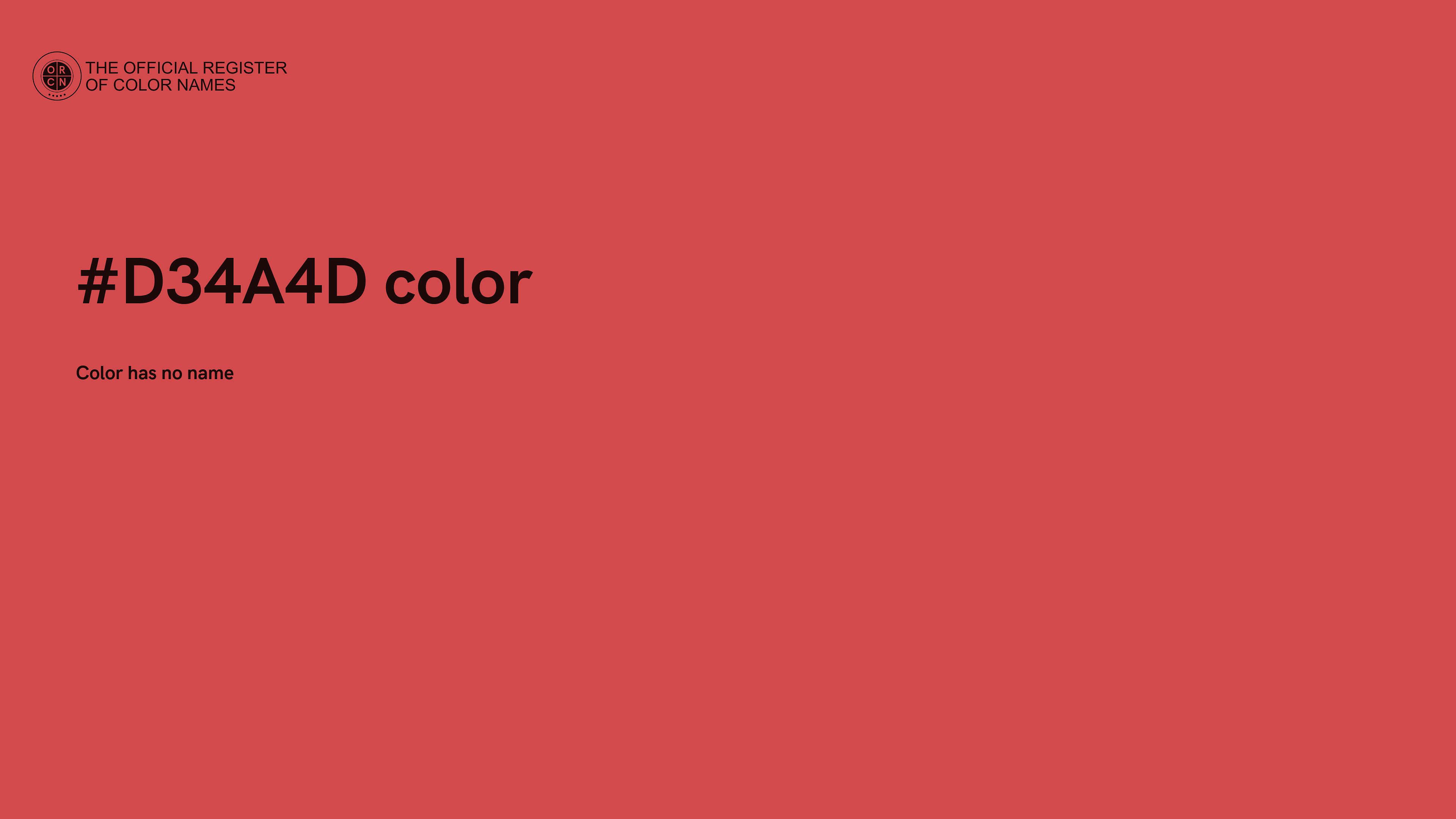The digital color HEX #D34A4D belongs to the Red Color Family featuring High Saturation (Saturation Family) and Light (Brightness Family).