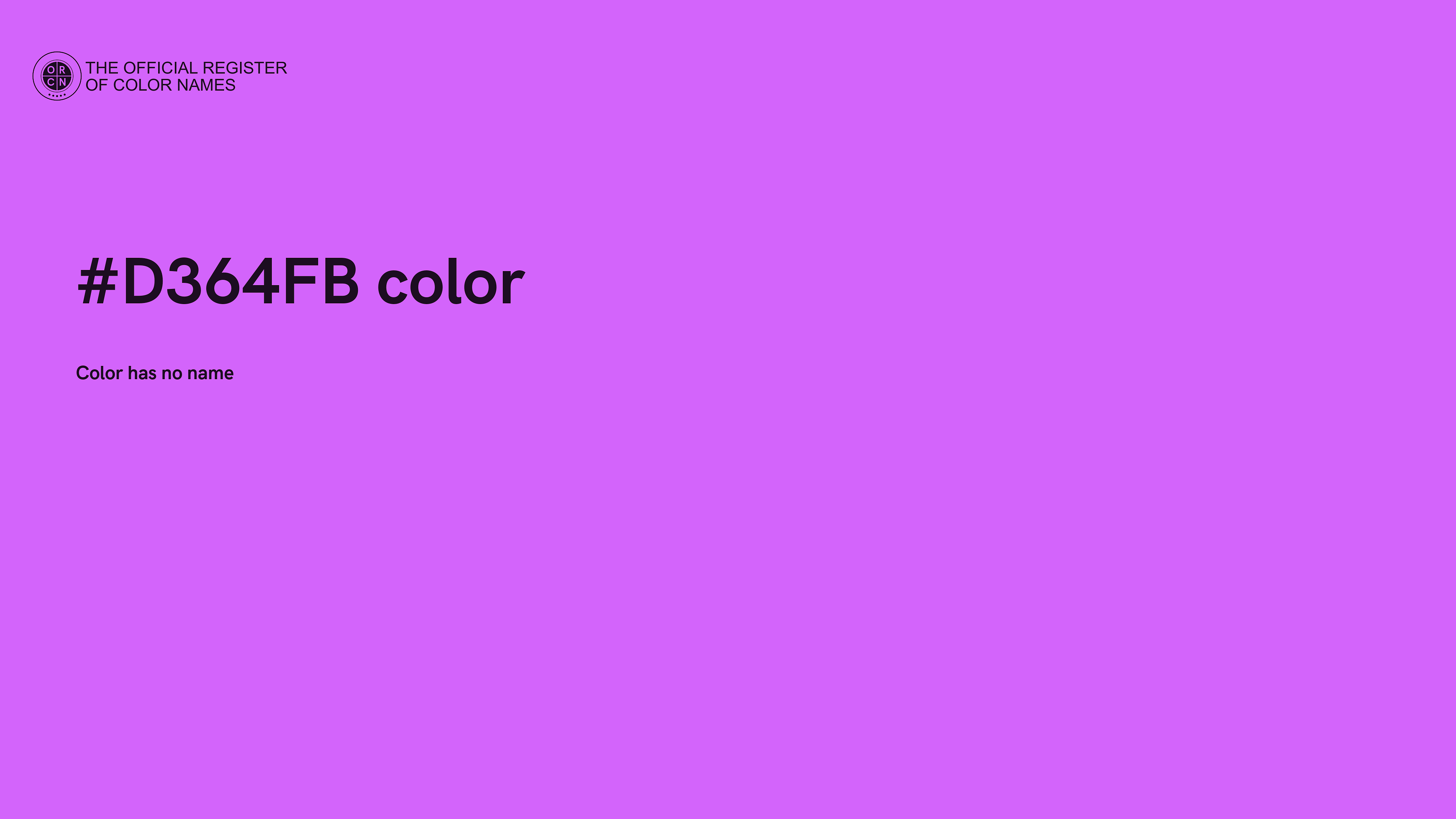 HEX code #D364FB represent the color in hexadecimal format by combining three values – the amounts of Red, Green and Blue (RGB). Its RGB composition is 211, 100, 251 ( rgb(211, 100, 251) ), which breaks down into 82.7% of Red, 39.2% Green and 98.4% Blue.