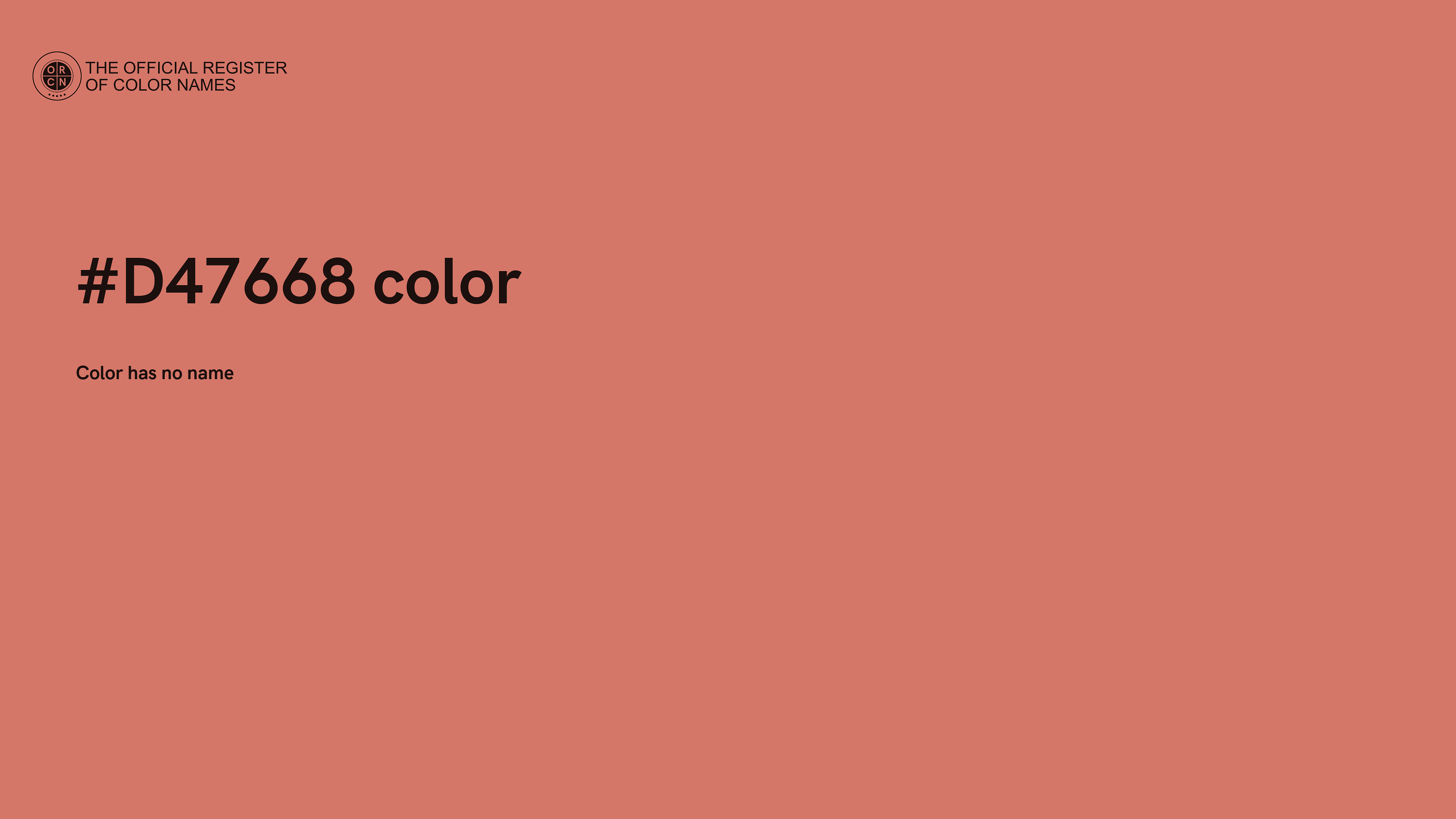 HEX code #D47668 represent the color in hexadecimal format by combining three values – the amounts of Red, Green and Blue (RGB). Its RGB composition is 212, 118, 104 ( rgb(212, 118, 104) ), which breaks down into 83.1% of Red, 46.3% Green and 40.8% Blue.