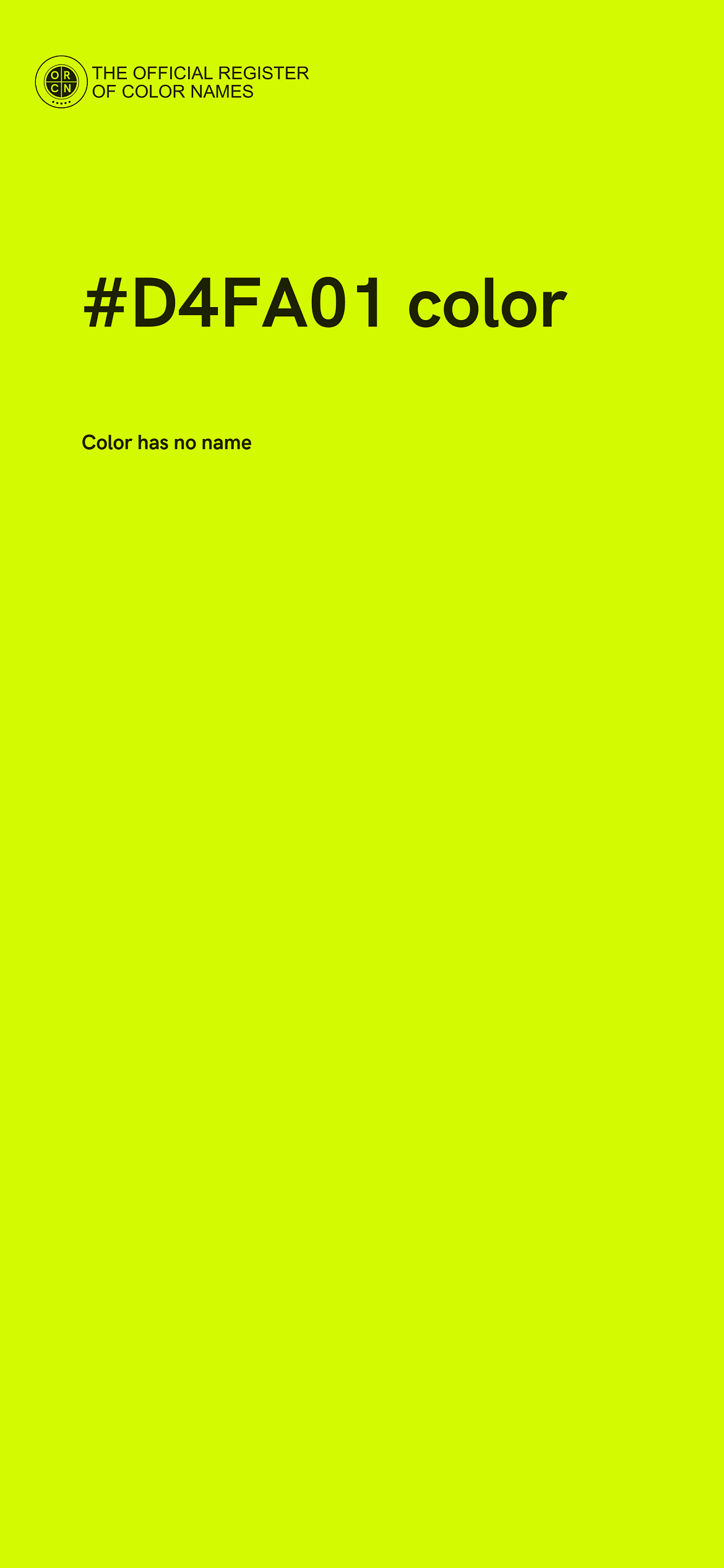 The digital color HEX #D4FA01 belongs to the Yellow Color Family featuring Full Saturation (Saturation Family) and Light (Brightness Family).