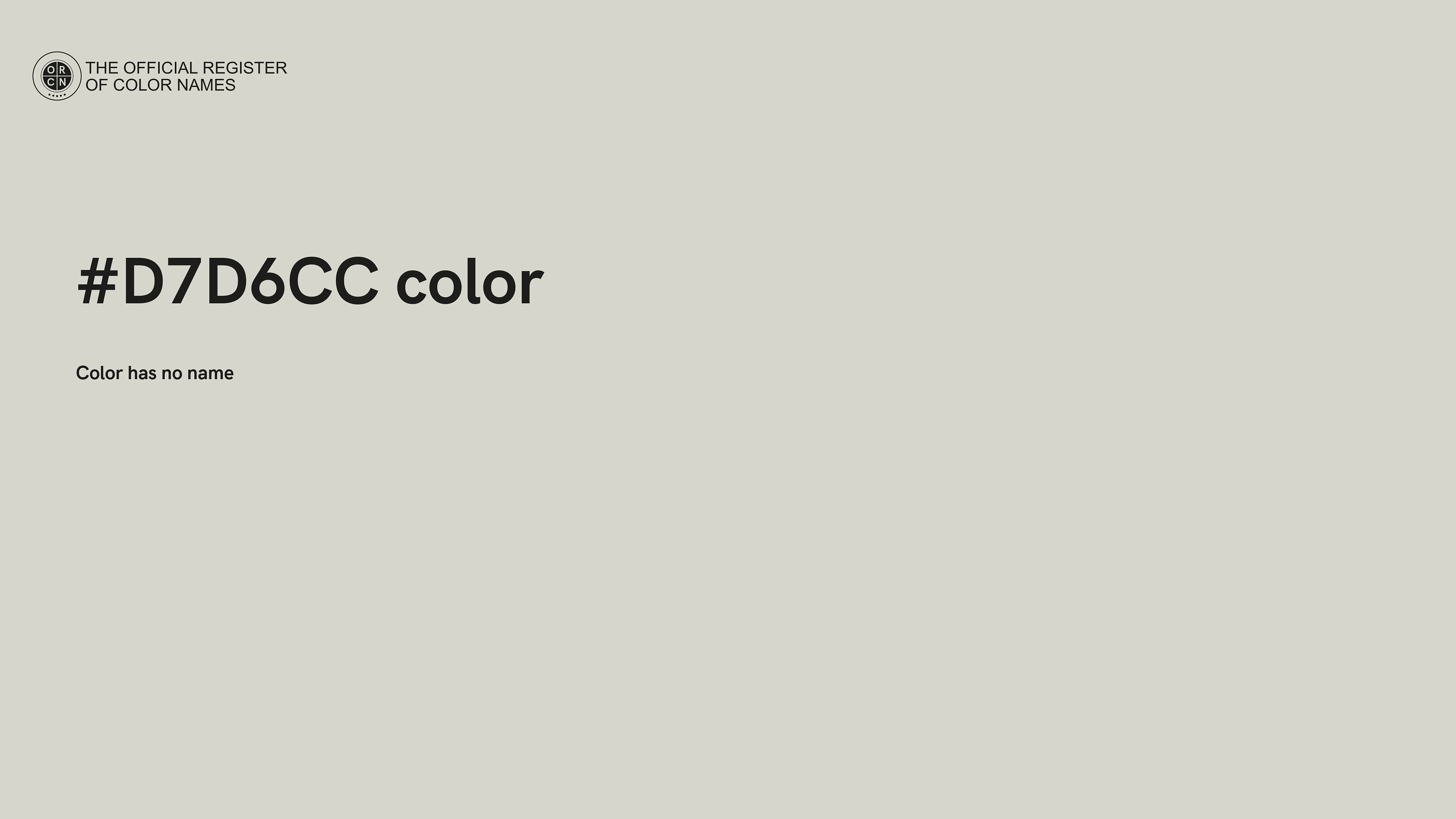 The digital color HEX #D7D6CC belongs to the Yellow Color Family featuring Low Saturation (Saturation Family) and Very Light (Brightness Family).