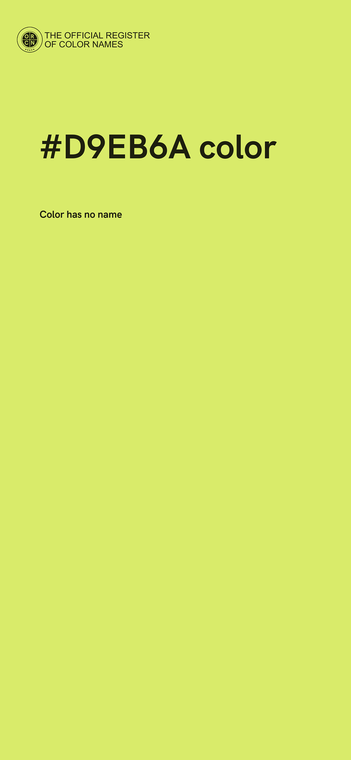 HEX code #D9EB6A represent the color in hexadecimal format by combining three values – the amounts of Red, Green and Blue (RGB). Its RGB composition is 217, 235, 106 ( rgb(217, 235, 106) ), which breaks down into 85.1% of Red, 92.2% Green and 41.6% Blue.