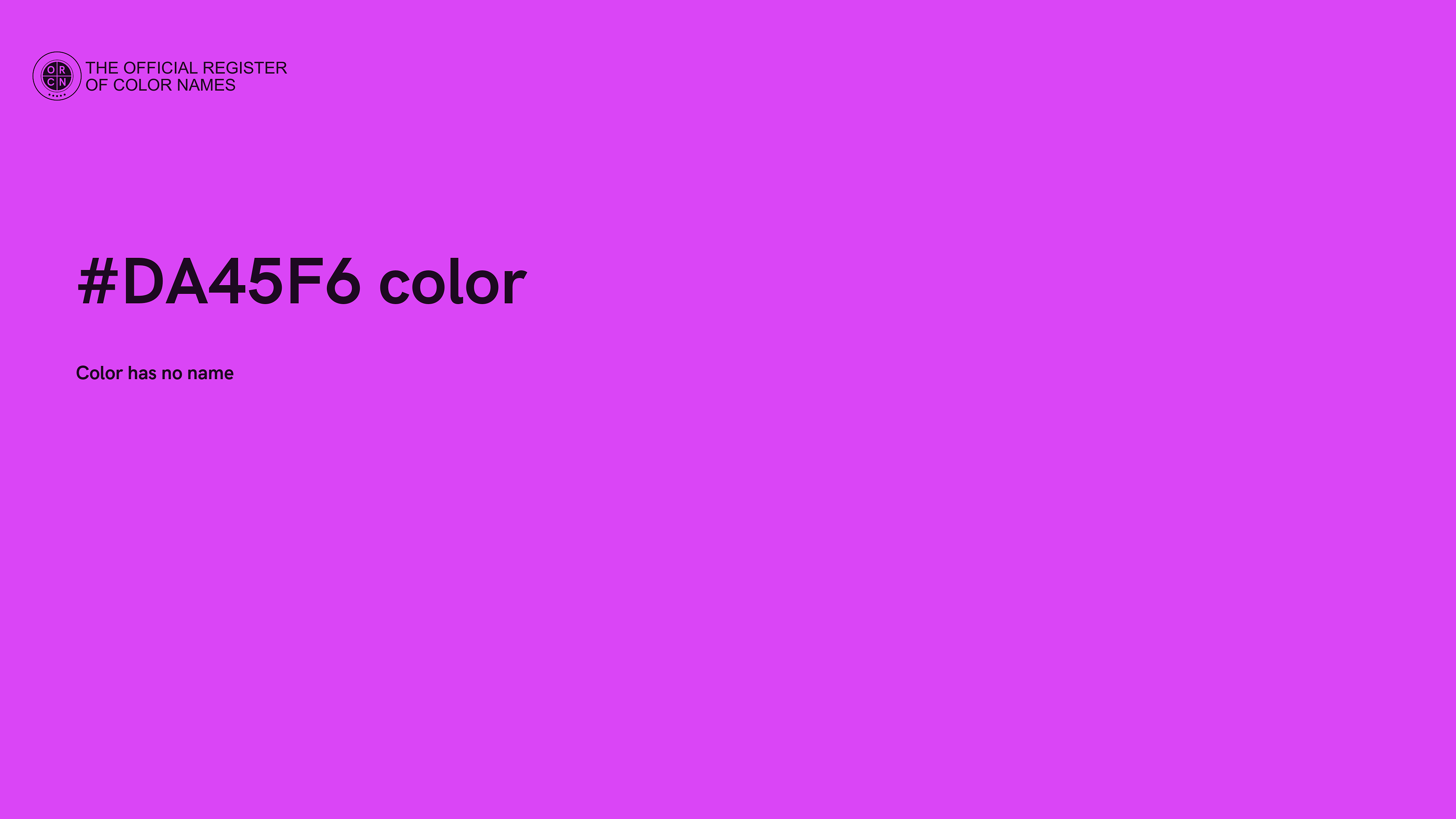 For printing in non digital world, #DA45F6 is represented in CMYK as 11 Cyan, 69 Magenta, 0 Yellow, and 4 Black (Key) (C:11 M:69 Y:0 K:4).