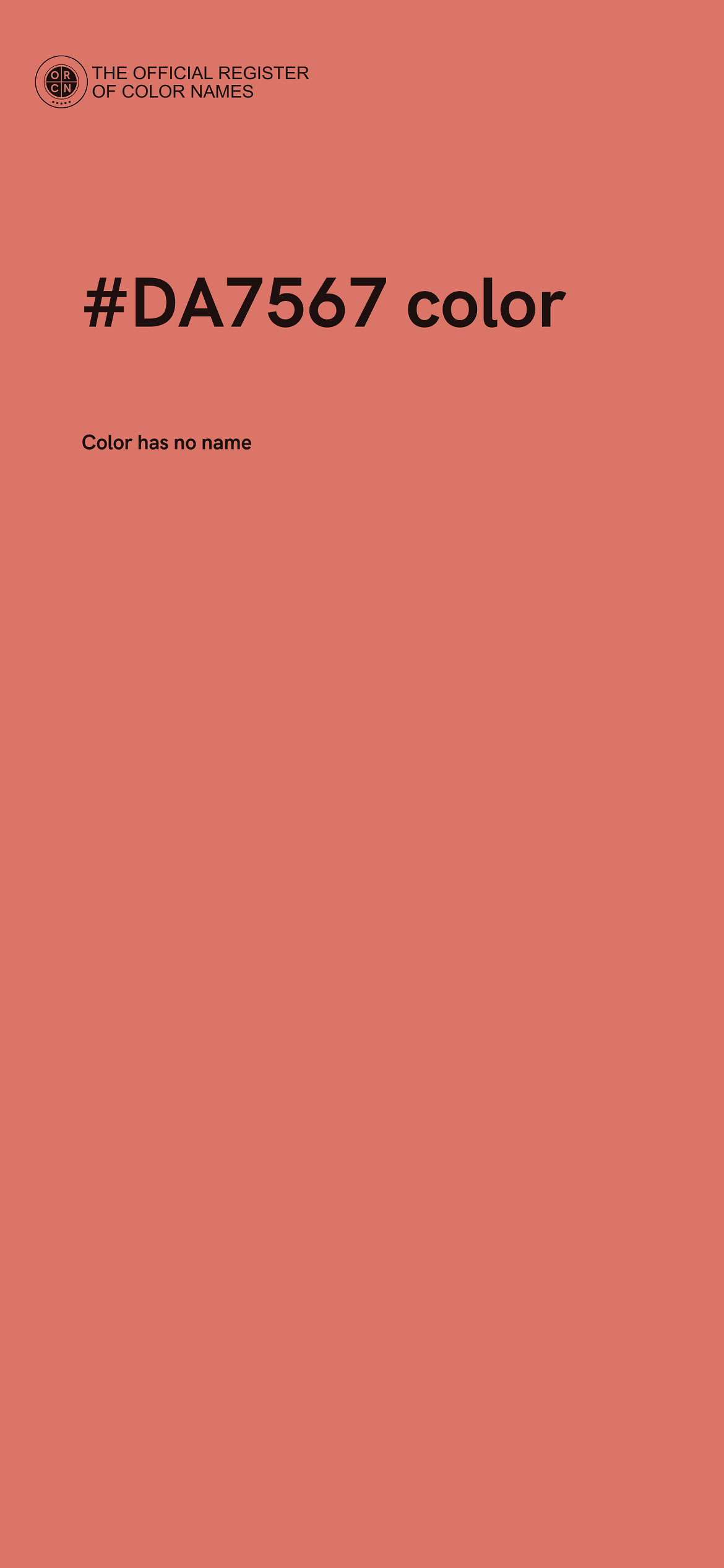For printing in non digital world, #DA7567 is represented in CMYK as 0 Cyan, 40 Magenta, 45 Yellow, and 15 Black (Key) (C:0 M:40 Y:45 K:15).