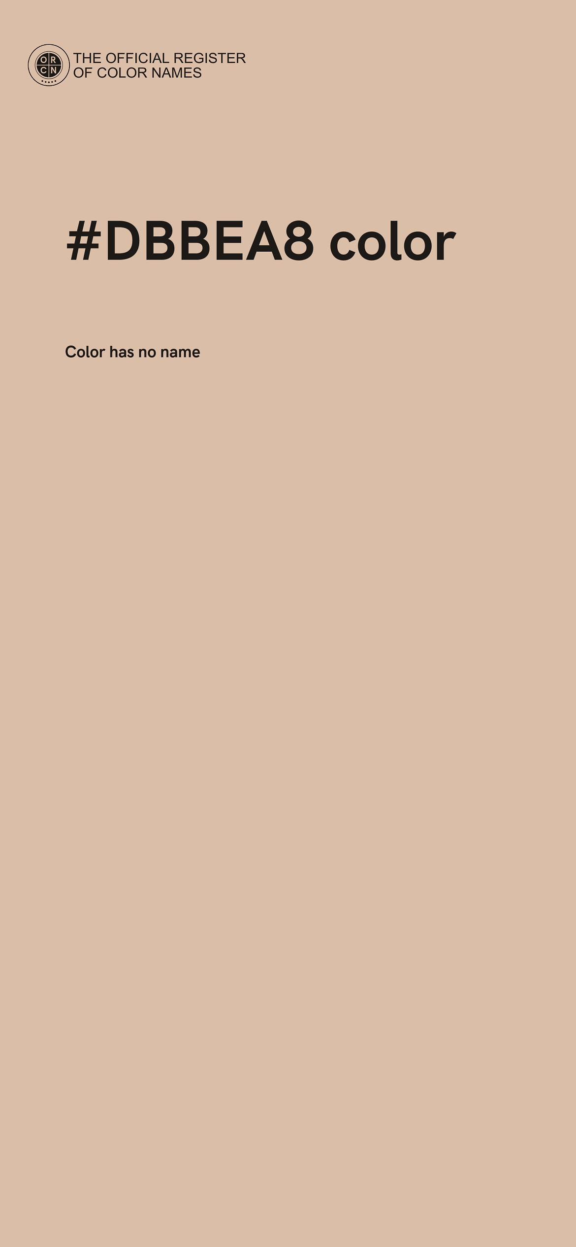 The digital color HEX #DBBEA8 belongs to the Orange Color Family featuring Moderate Saturation (Saturation Family) and Very Light (Brightness Family).