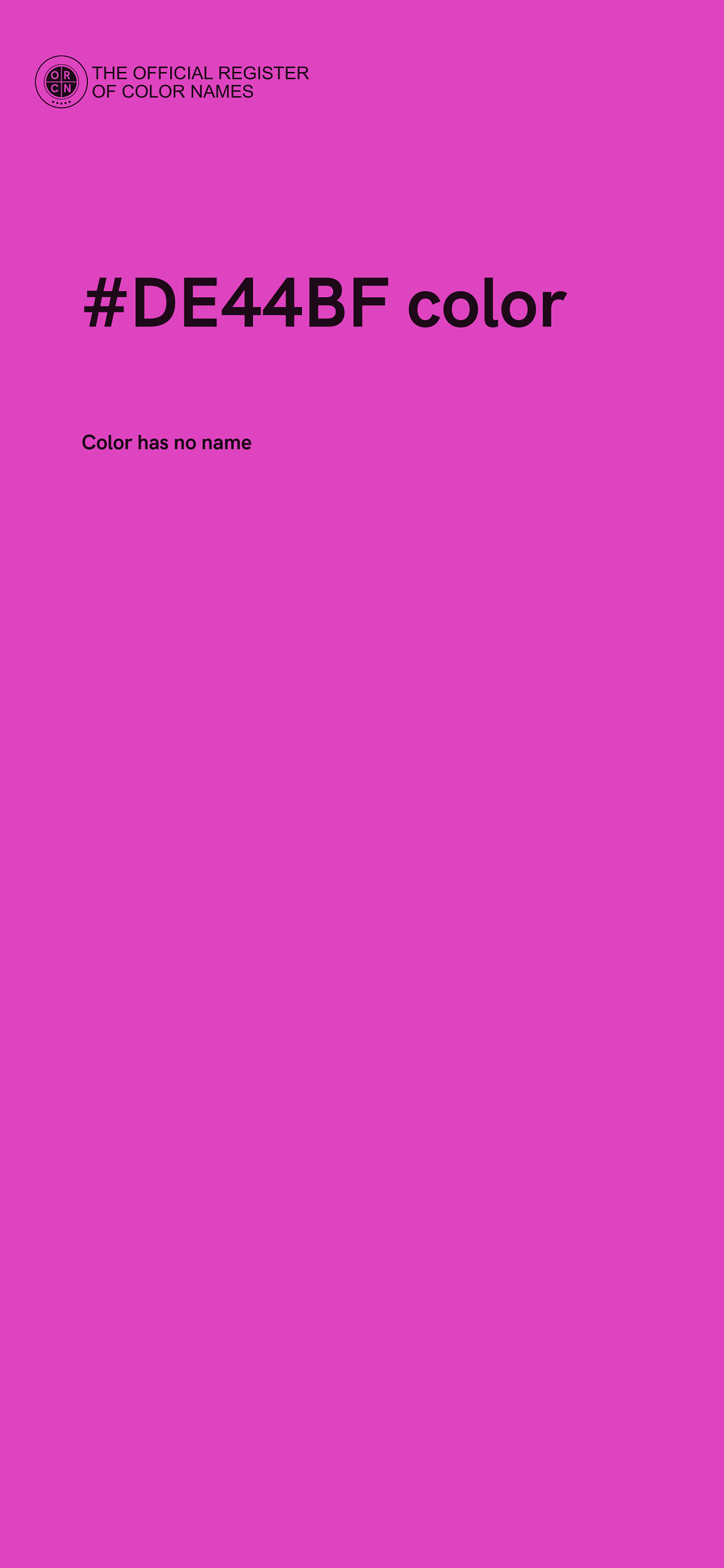 For printing in non digital world, #DE44BF is represented in CMYK as 0 Cyan, 60 Magenta, 12 Yellow, and 13 Black (Key) (C:0 M:60 Y:12 K:13).