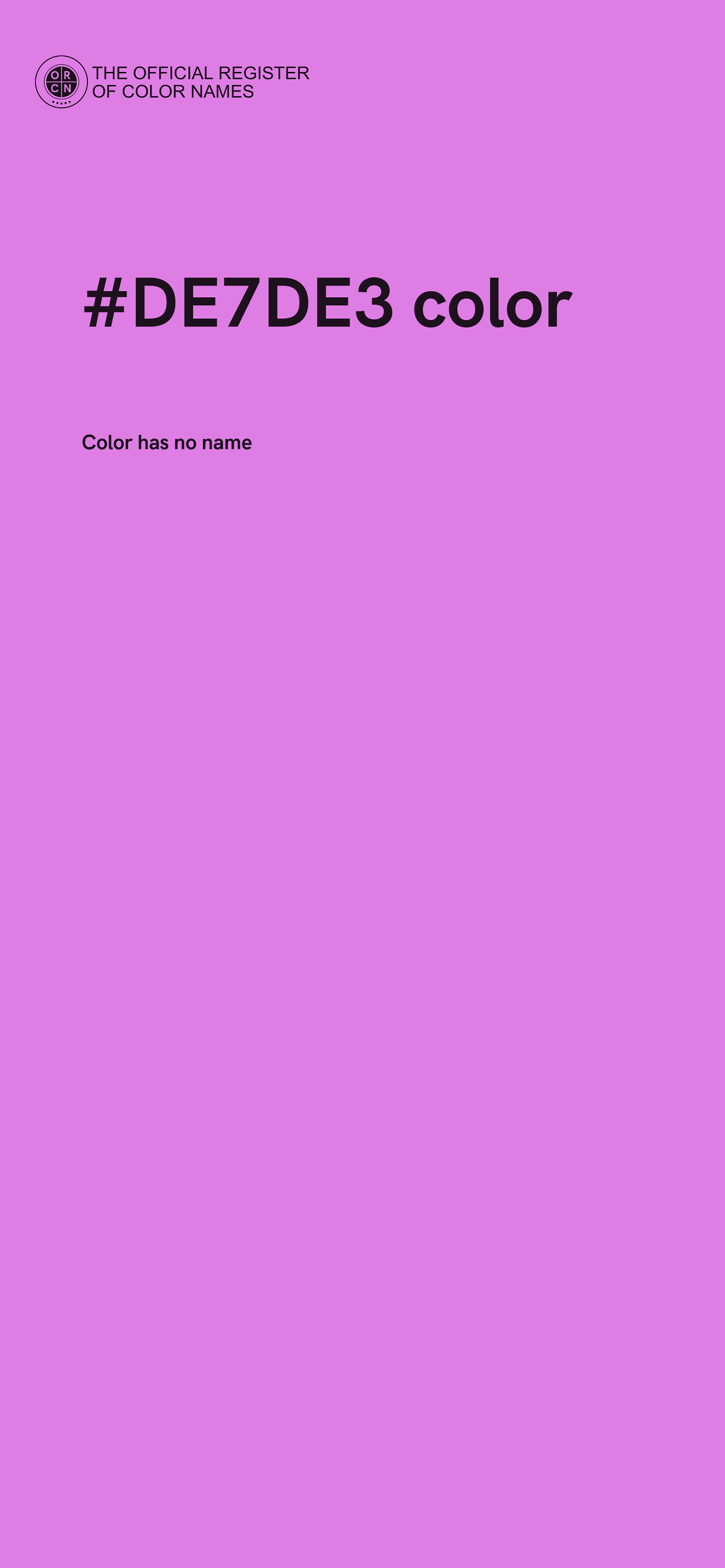 The digital color HEX #DE7DE3 belongs to the Magenta Color Family featuring High Saturation (Saturation Family) and Very Light (Brightness Family).