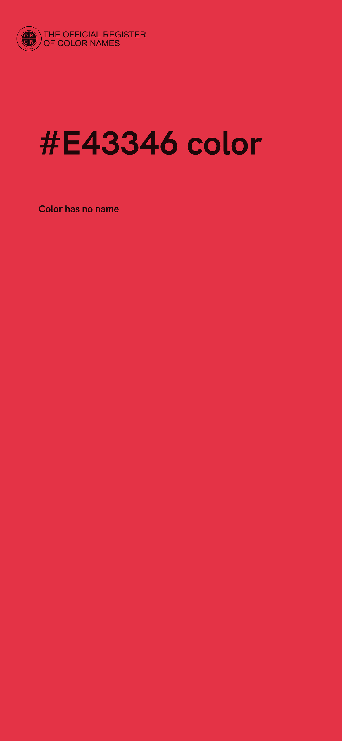 HEX code #E43346 represent the color in hexadecimal format by combining three values – the amounts of Red, Green and Blue (RGB). Its RGB composition is 228, 51, 70 ( rgb(228, 51, 70) ), which breaks down into 89.4% of Red, 20% Green and 27.5% Blue.