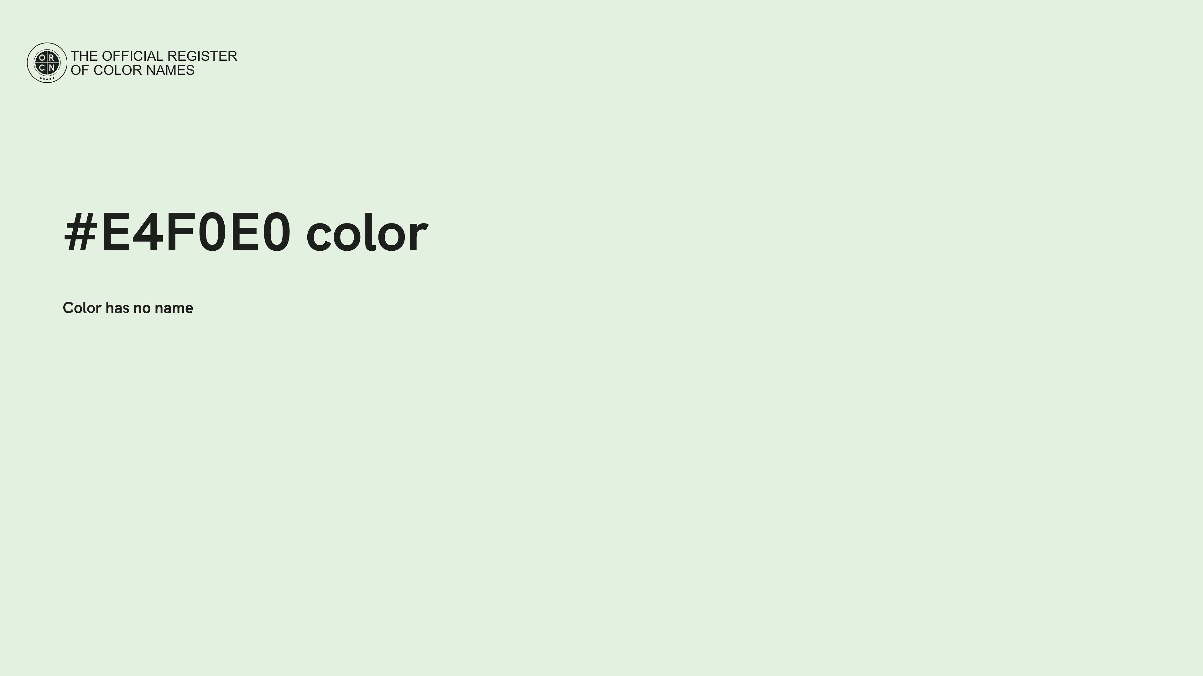 The digital color HEX #E4F0E0 belongs to the Green Color Family featuring Mild Saturation (Saturation Family) and Luminous (Brightness Family).