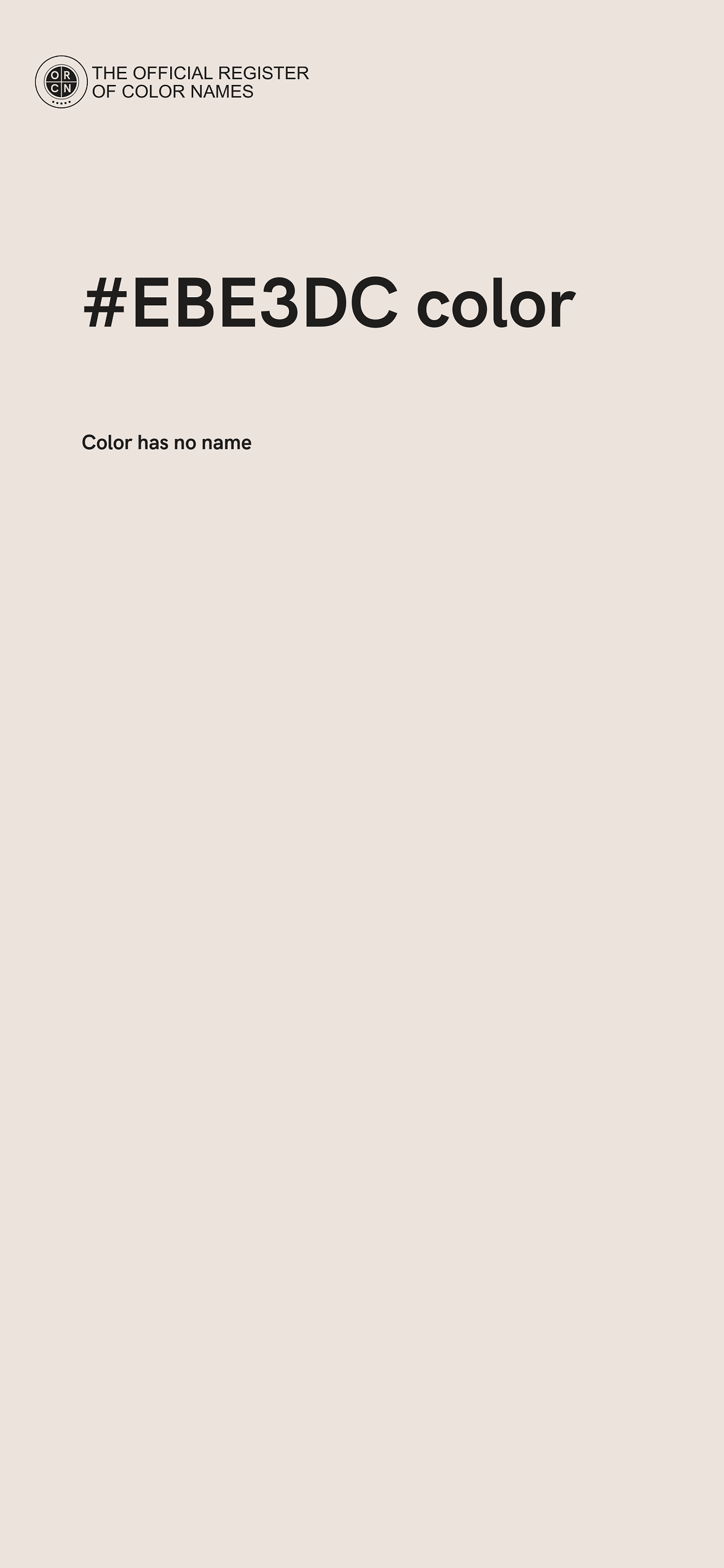 For printing in non digital world, #EBE3DC is represented in CMYK as 0 Cyan, 3 Magenta, 6 Yellow, and 8 Black (Key) (C:0 M:3 Y:6 K:8).