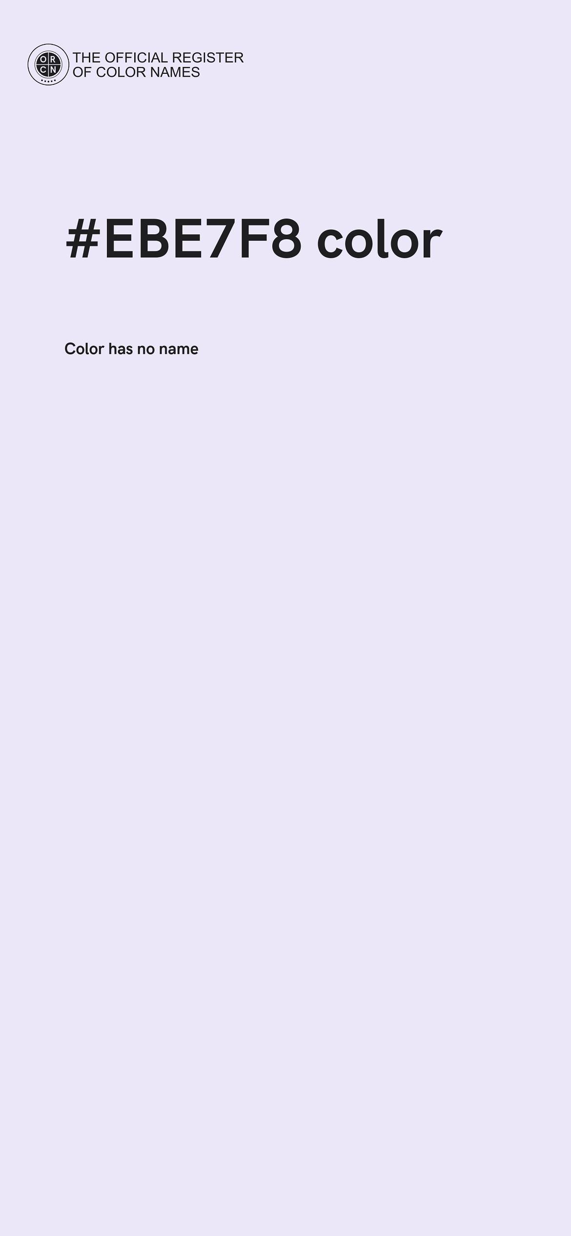 The digital color HEX #EBE7F8 belongs to the Blue Color Family featuring Moderate Saturation (Saturation Family) and Luminous (Brightness Family).