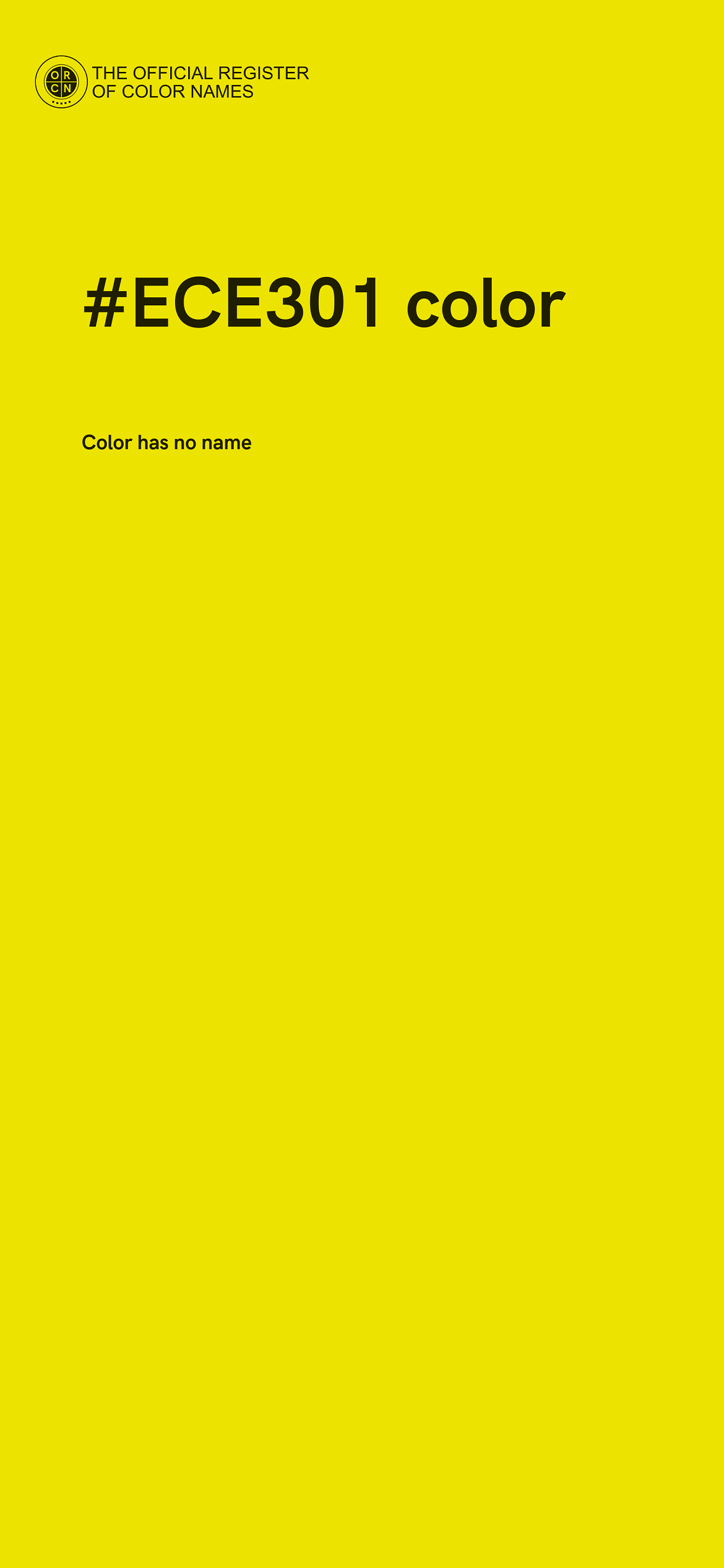 HEX code #ECE301 represent the color in hexadecimal format by combining three values – the amounts of Red, Green and Blue (RGB). Its RGB composition is 236, 227, 1 ( rgb(236, 227, 1) ), which breaks down into 92.5% of Red, 89% Green and 0.4% Blue.