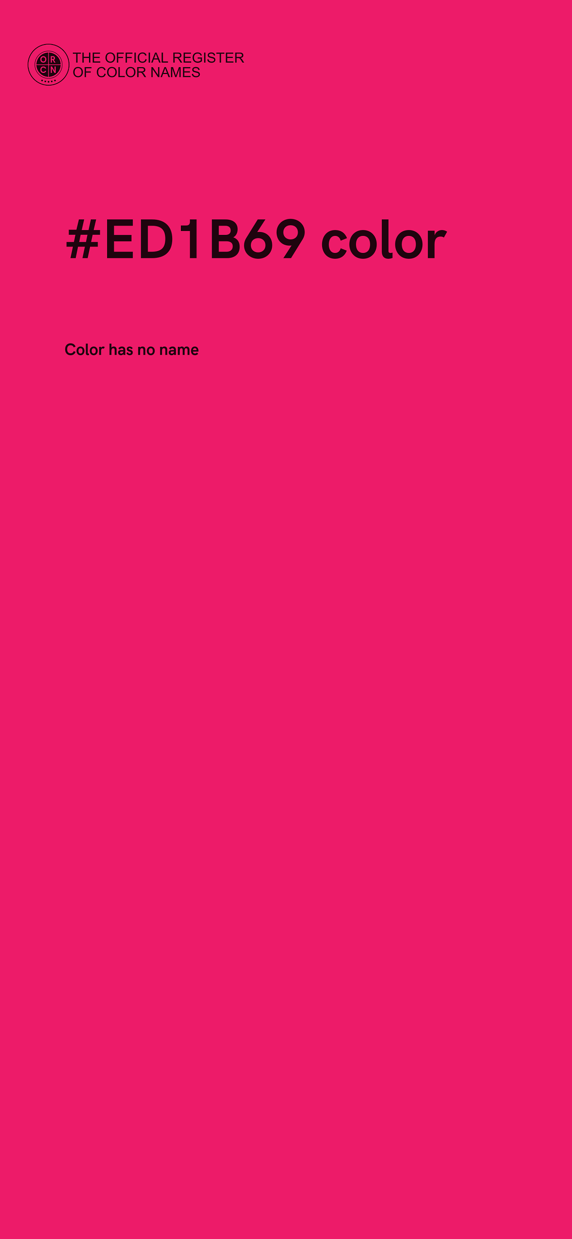 HEX code #ED1B69 represent the color in hexadecimal format by combining three values – the amounts of Red, Green and Blue (RGB). Its RGB composition is 237, 27, 105 ( rgb(237, 27, 105) ), which breaks down into 92.9% of Red, 10.6% Green and 41.2% Blue.