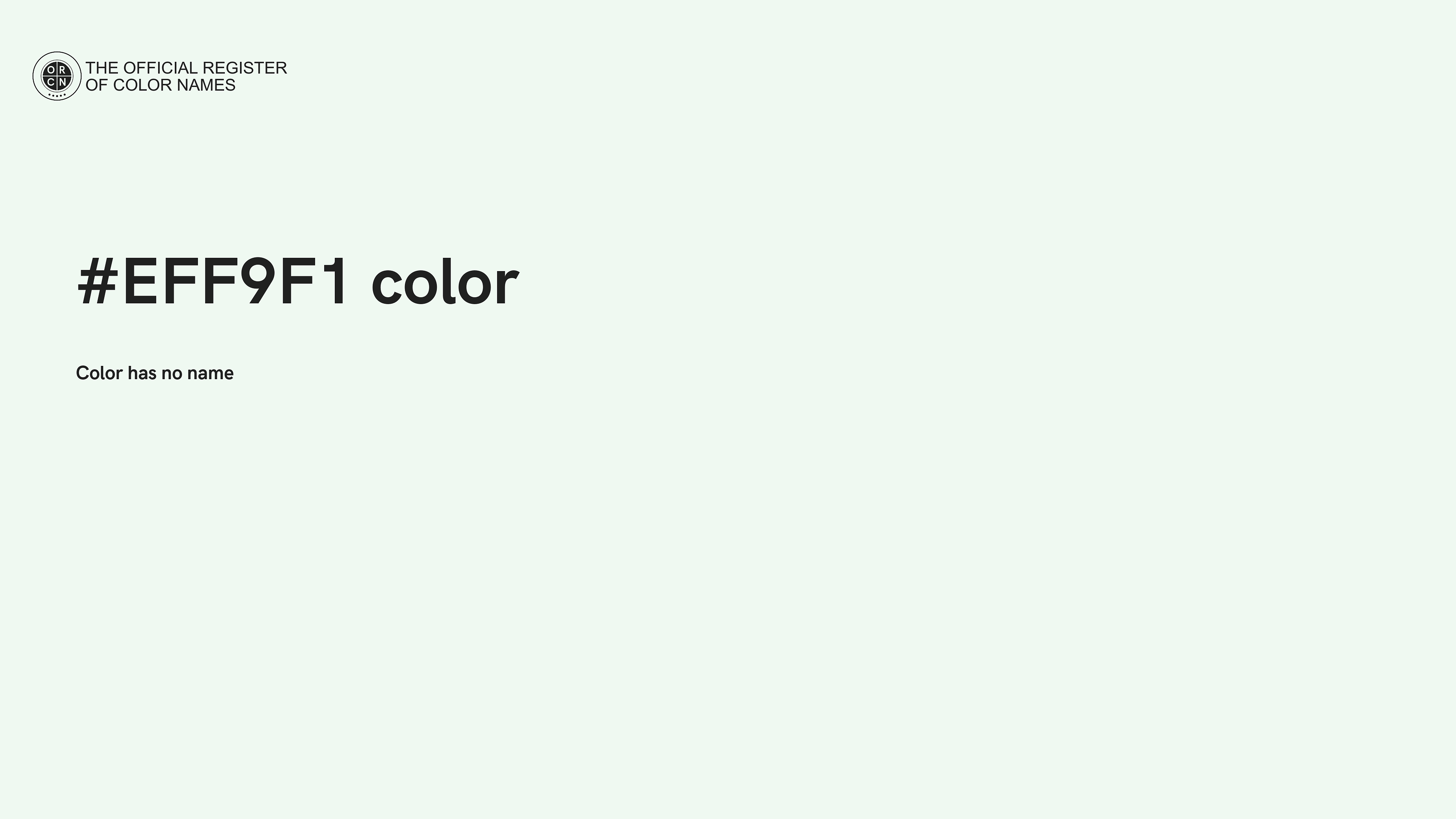 The digital color HEX #EFF9F1 belongs to the Green Color Family featuring Moderate Saturation (Saturation Family) and Luminous (Brightness Family).