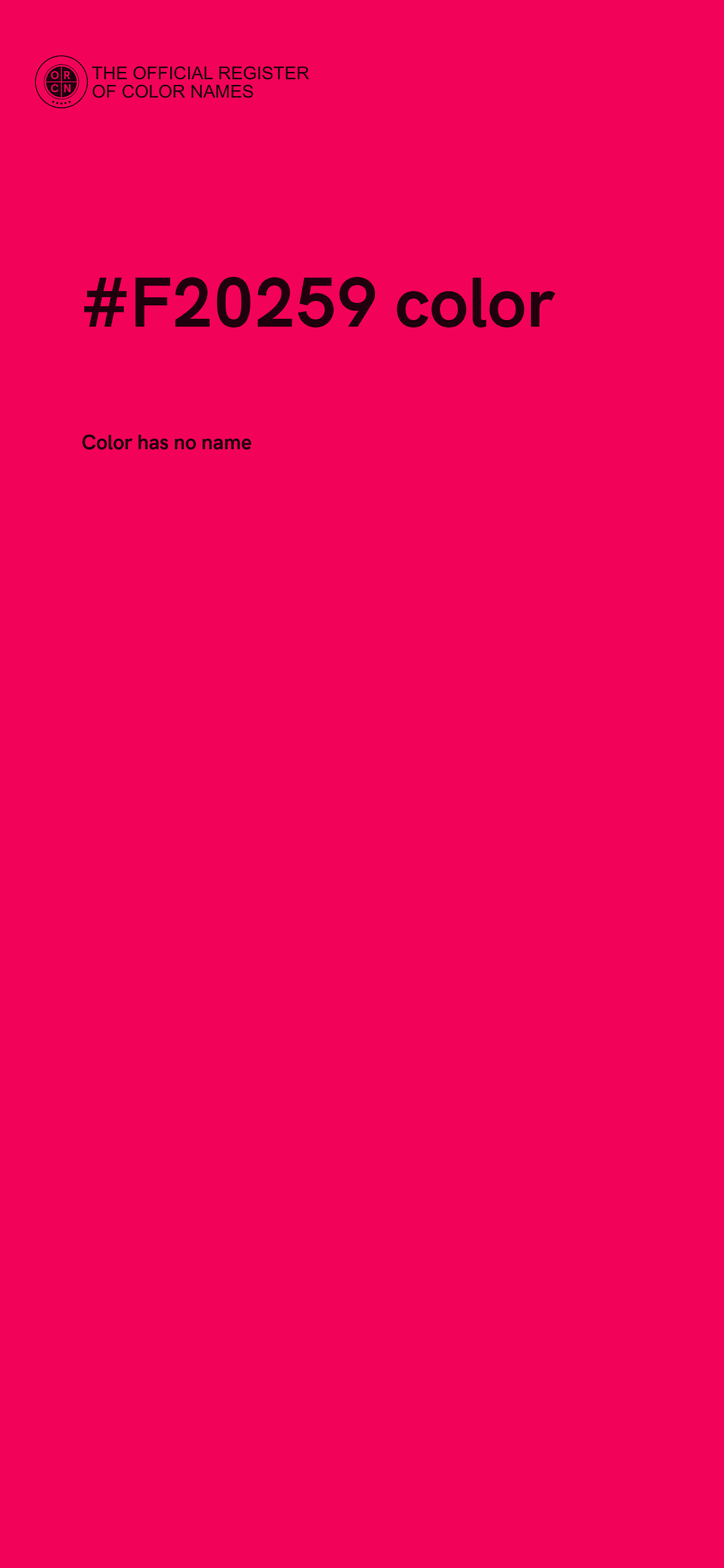 The digital color HEX #F20259 belongs to the Rose Color Family featuring Full Saturation (Saturation Family) and Light (Brightness Family).