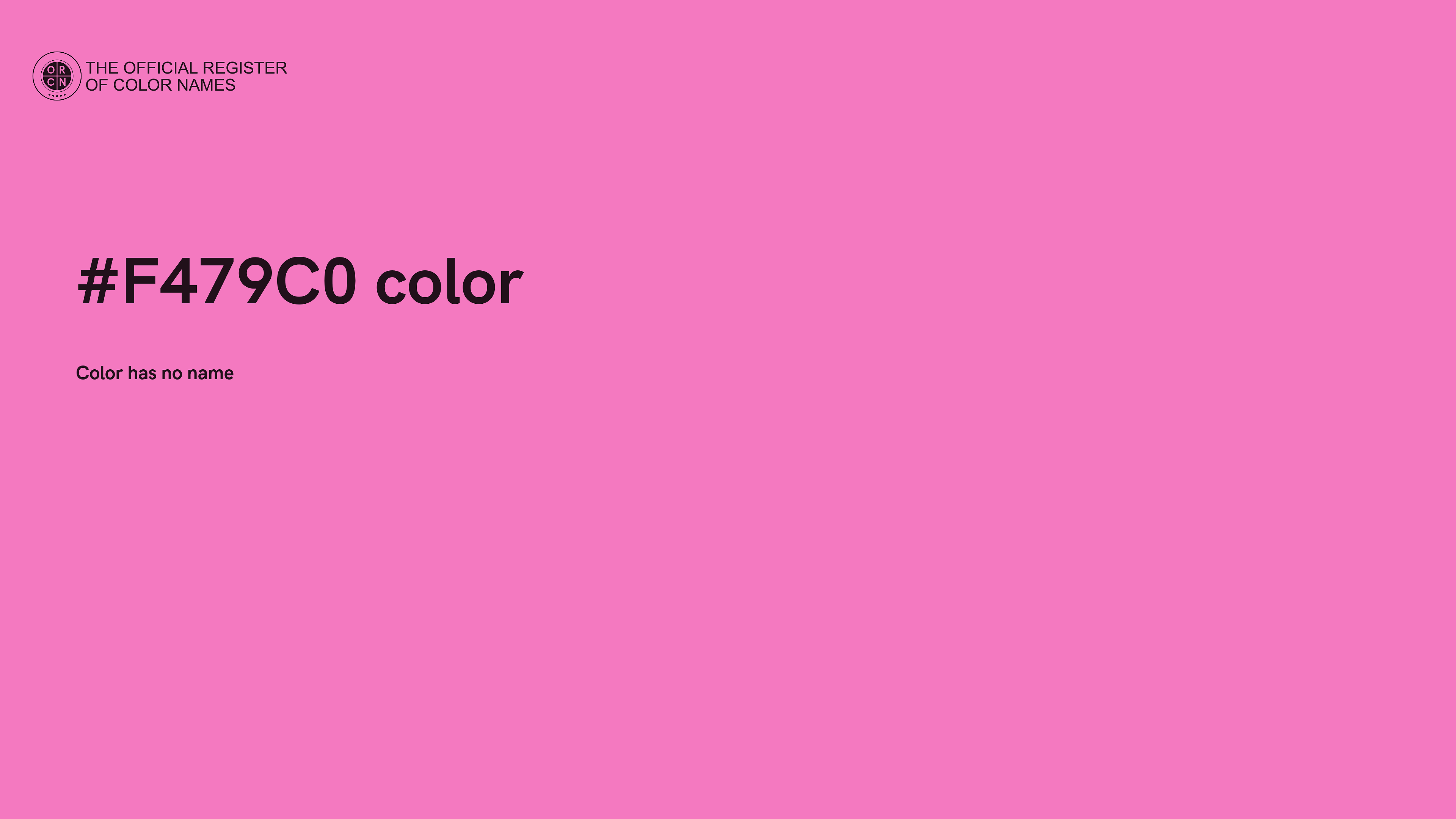 HEX code #F479C0 represent the color in hexadecimal format by combining three values – the amounts of Red, Green and Blue (RGB). Its RGB composition is 244, 121, 192 ( rgb(244, 121, 192) ), which breaks down into 95.7% of Red, 47.5% Green and 75.3% Blue.