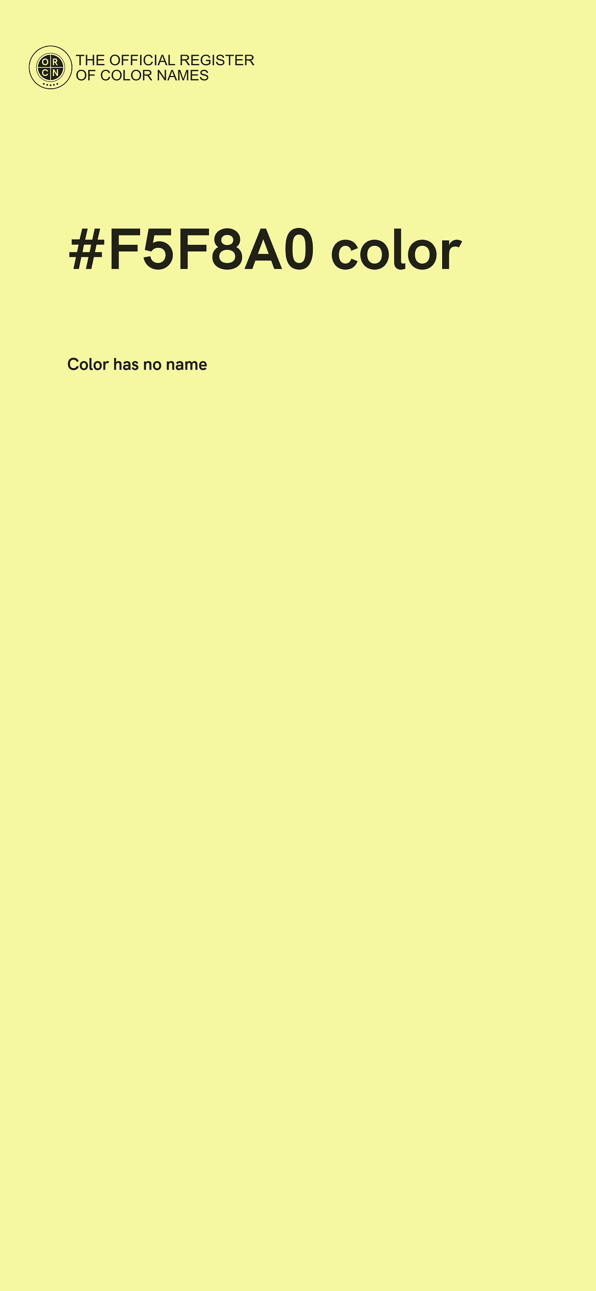 The digital color HEX #F5F8A0 belongs to the Yellow Color Family featuring Full Saturation (Saturation Family) and Very Light (Brightness Family).