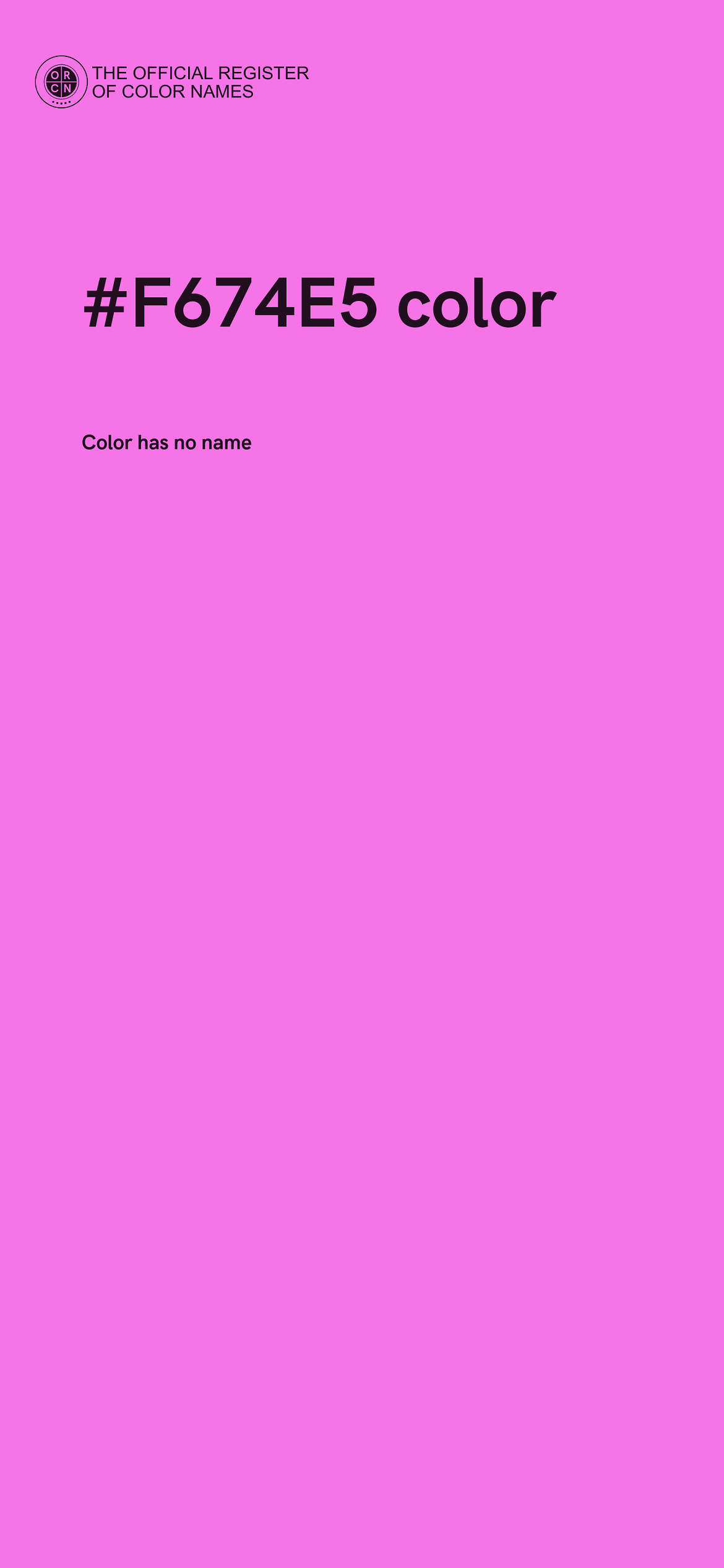 The digital color HEX #F674E5 belongs to the Magenta Color Family featuring Full Saturation (Saturation Family) and Very Light (Brightness Family).
