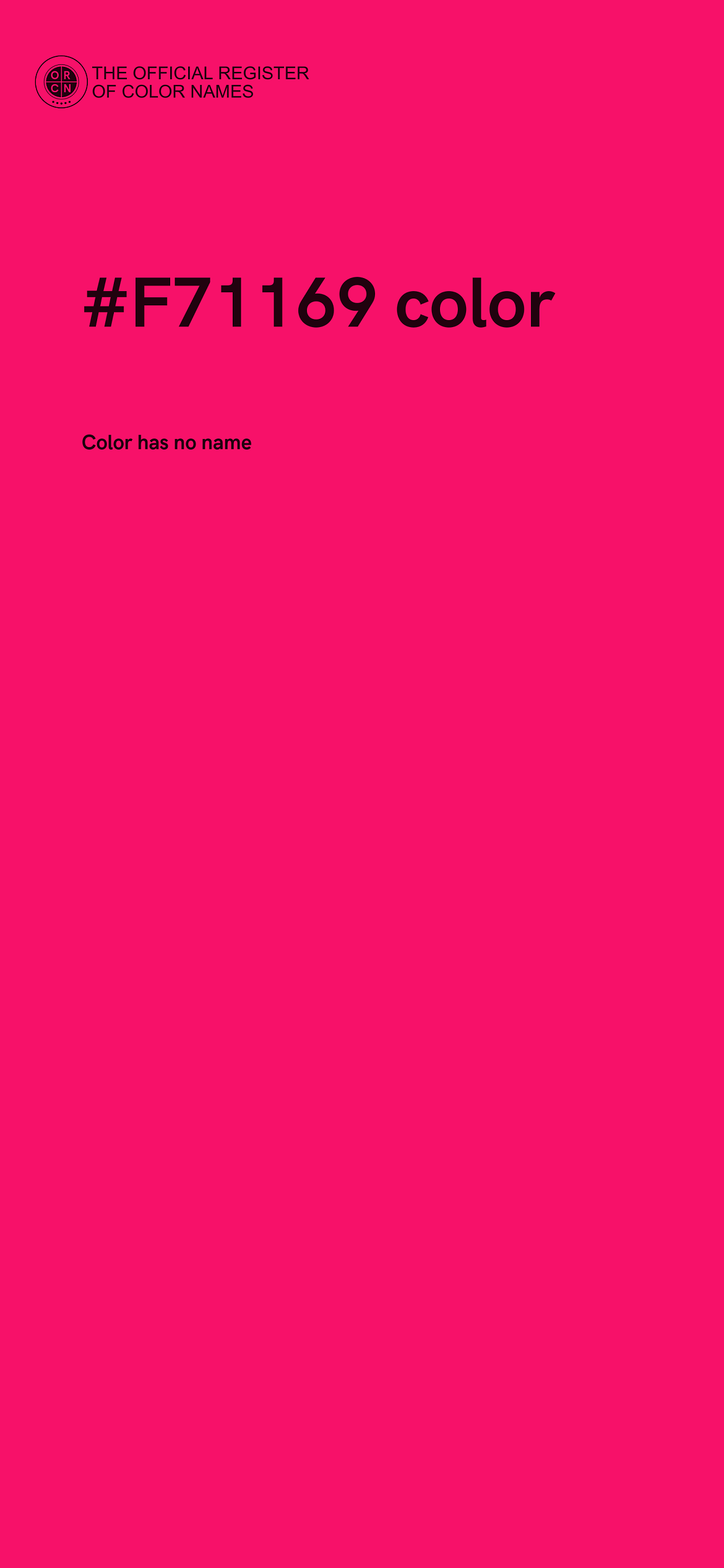 The digital color HEX #F71169 belongs to the Rose Color Family featuring Full Saturation (Saturation Family) and Light (Brightness Family).