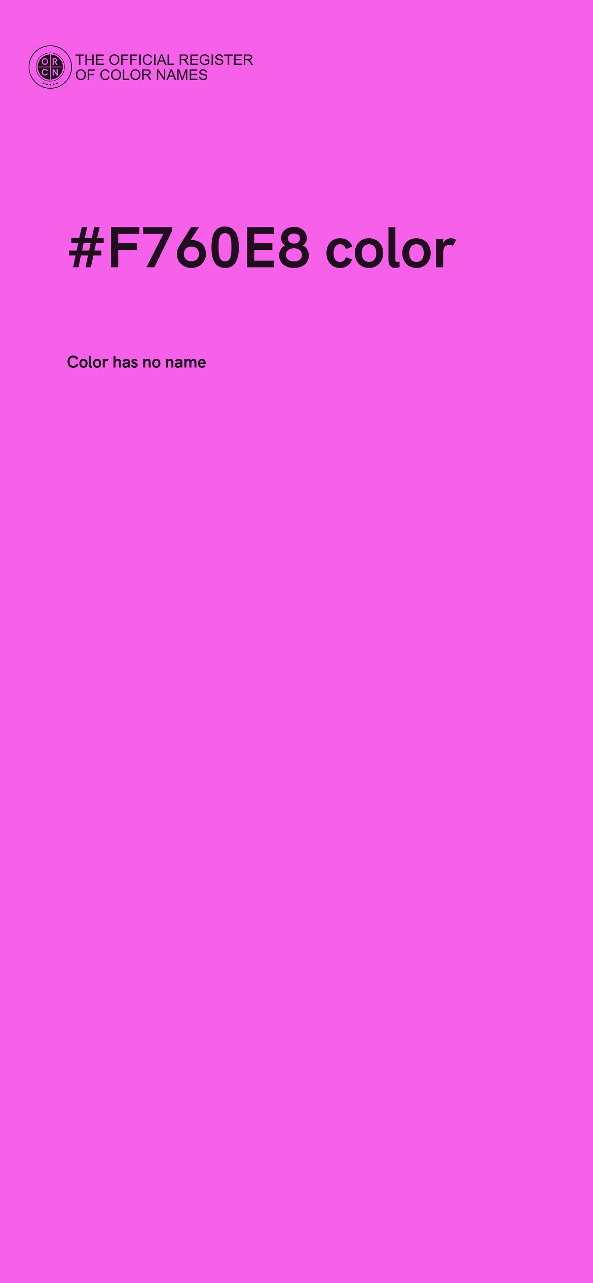 The digital color HEX #F760E8 belongs to the Magenta Color Family featuring Full Saturation (Saturation Family) and Very Light (Brightness Family).