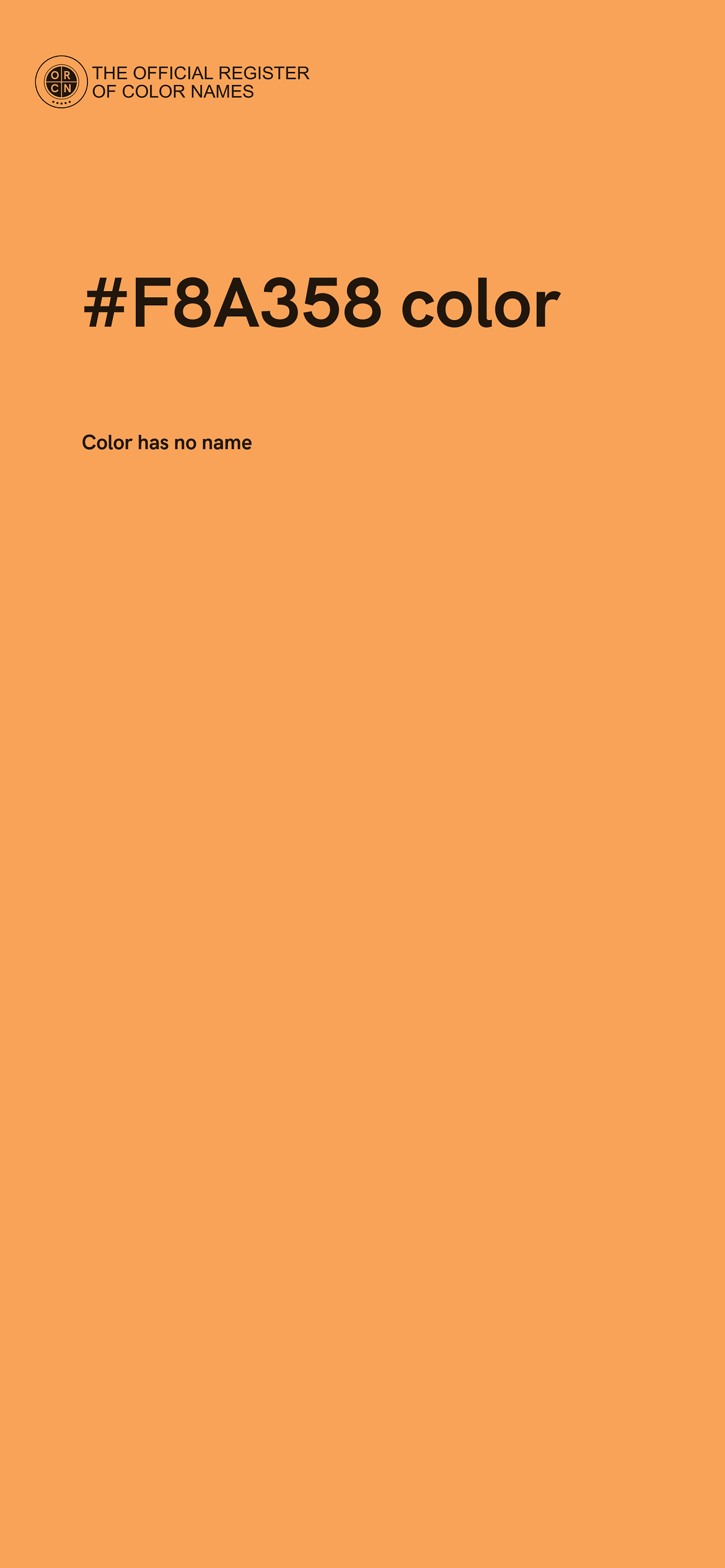 The digital color HEX #F8A358 belongs to the Orange Color Family featuring Full Saturation (Saturation Family) and Very Light (Brightness Family).