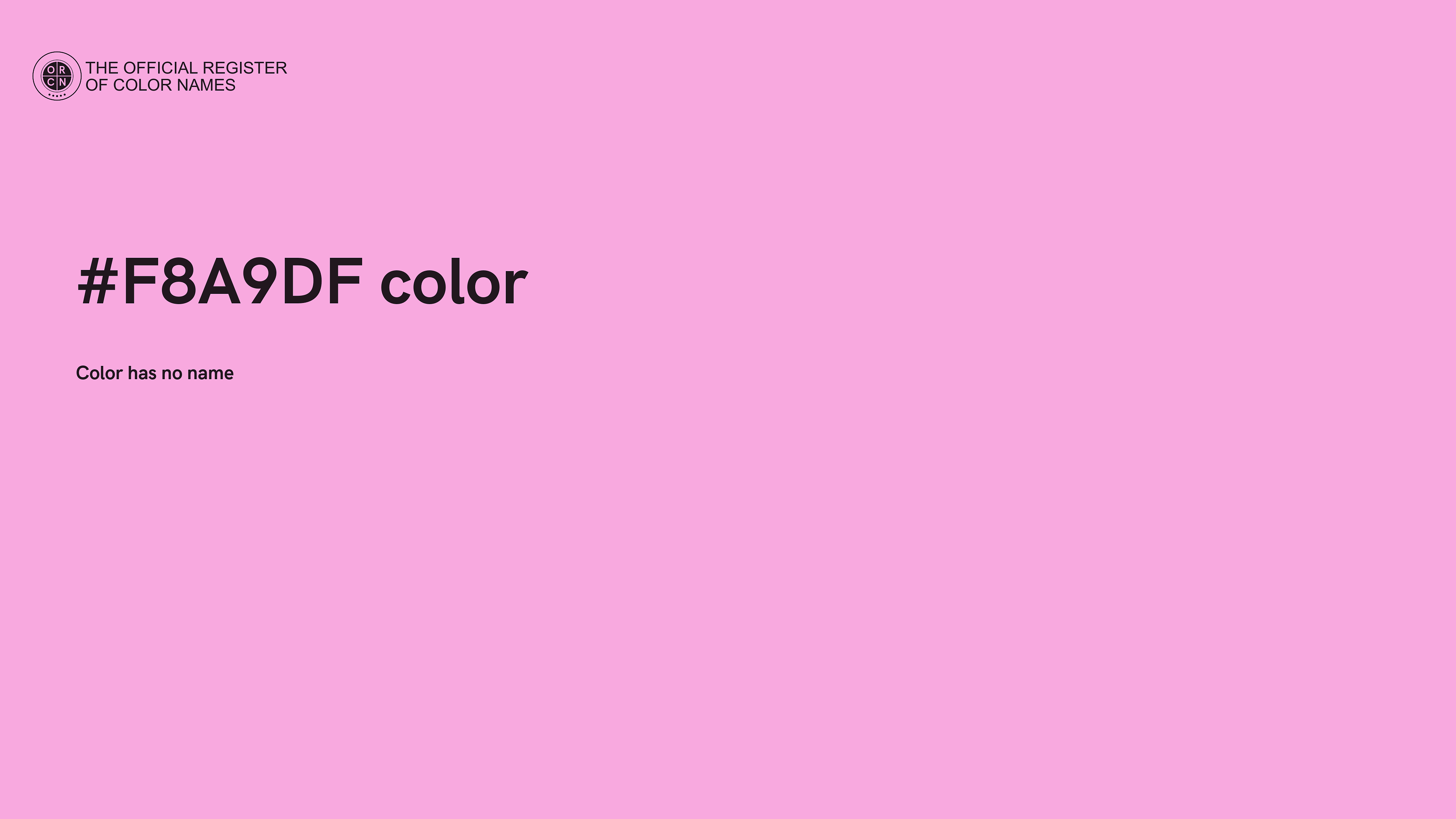 The digital color HEX #F8A9DF belongs to the Rose Color Family featuring Full Saturation (Saturation Family) and Very Light (Brightness Family).