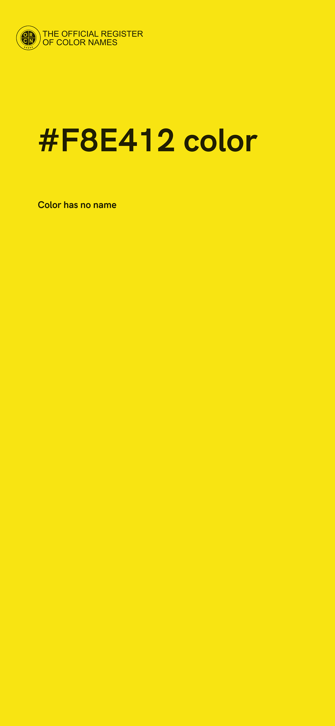 The digital color HEX #F8E412 belongs to the Yellow Color Family featuring Full Saturation (Saturation Family) and Light (Brightness Family).