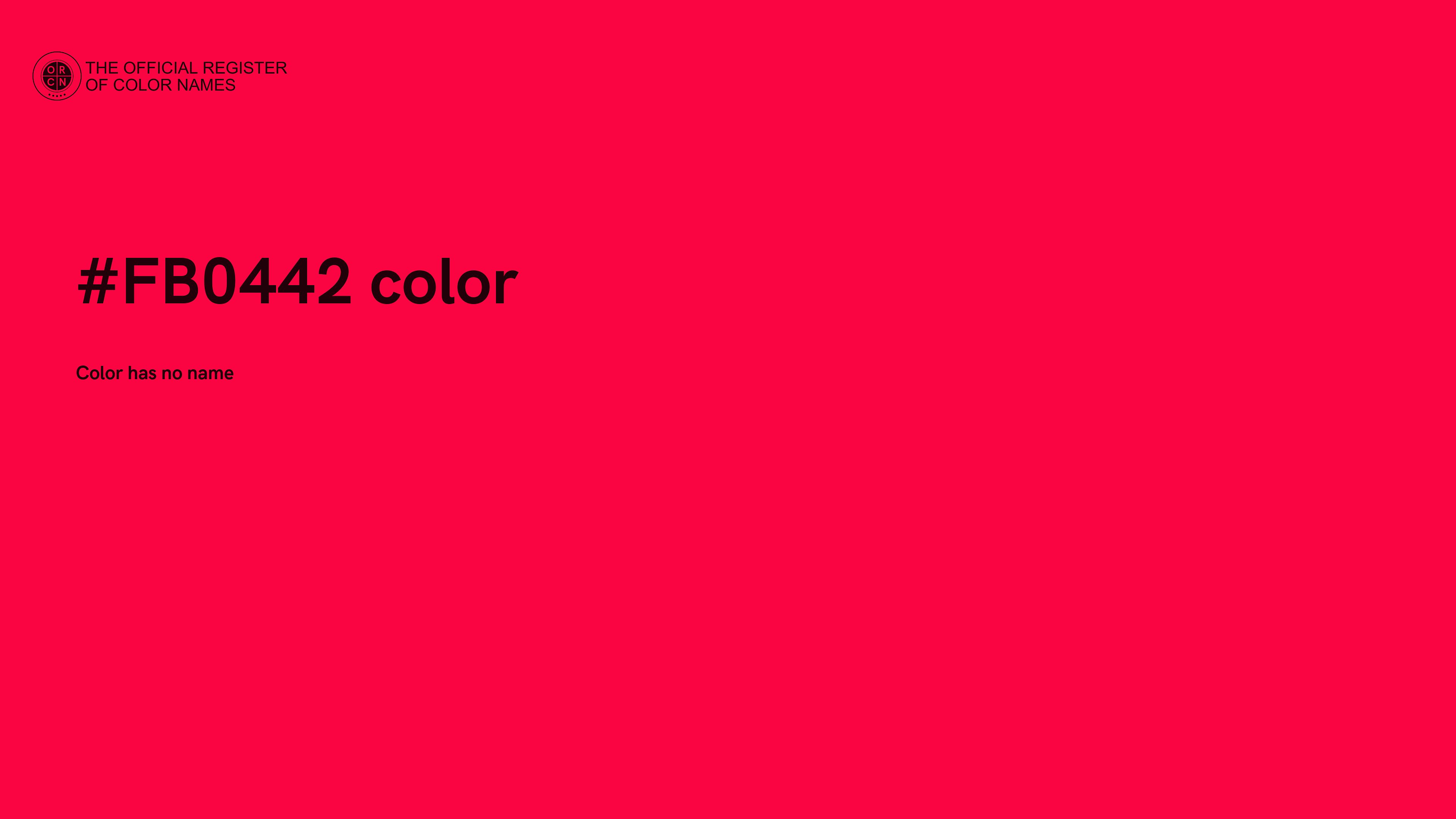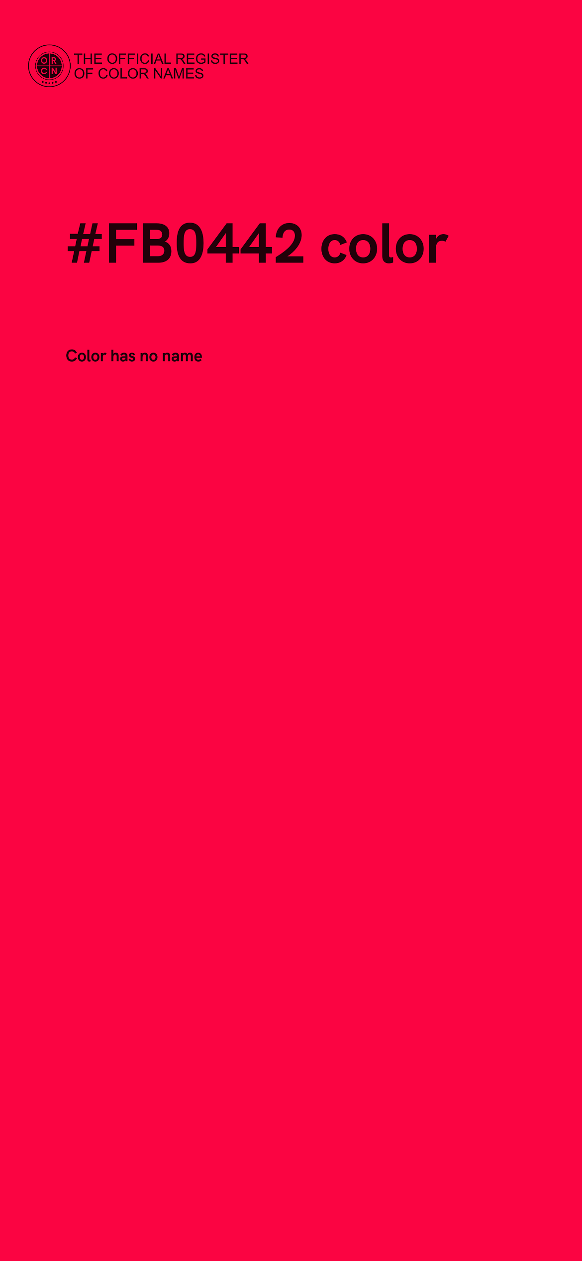 The digital color HEX #FB0442 belongs to the Red Color Family featuring Full Saturation (Saturation Family) and Light (Brightness Family).